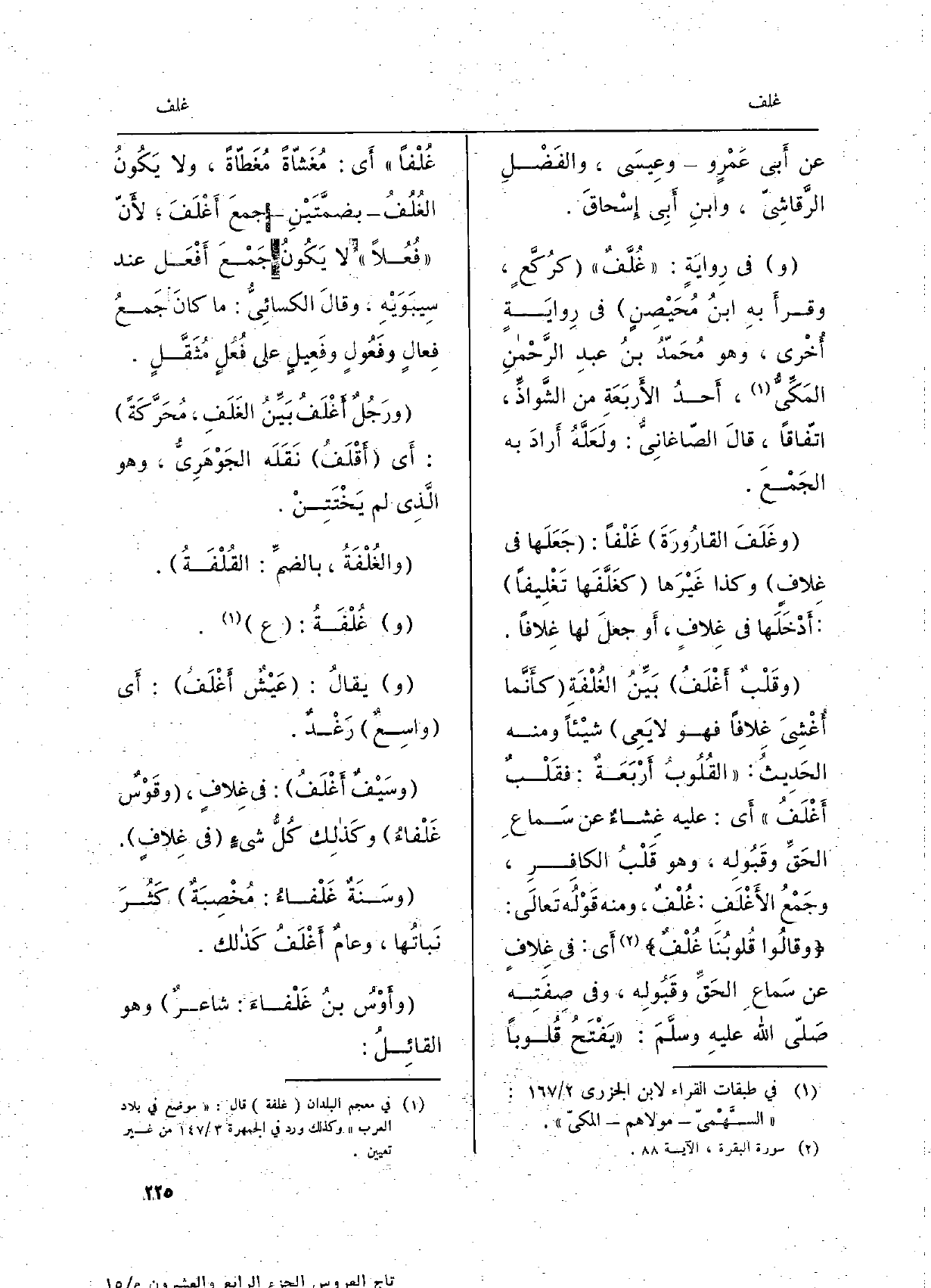عَن أَبي عَمْرو وَعِيسَى، والفضلِ الرَّقاشي، وَابْن أَبي إِسْحاقَ. وَفِي رِوايَةٍ: غُلَّفٌ، كرُكَّعٍ، وقرأَ بهِ ابنُ مُحَيْصِنٍ فِي رِوايَةٍ أُخْرى، وَهُوَ محمدُ بن عبد الرَّحْمَن المَكِّيُّ، أحدُ الأربعةِ من الشَّواذِّ، اتِّفَاقًا، قَالَ الصاغانيُّ: ولَعَلَّهُ أَرادَ بِهِ الجَمْعَ. وغَلَفَ القارُورَةَ غَلْفَاً: جَعَلَها فِي غِلافٍ وَكَذَا غَيْرَها كغَلَّفَها تَغْلِيفاً: أَدْخَلَها فِي غِلافٍ، أَو جَعلَ لَهَا غِلافاً. وقَلْبٌ أَغْلَفُ بَيِّنُ الغُلْفَةِ كأَنَّما أُغْشِيَ غِلافاً فَهُوَ لَا يَعِي شَيْئا وَمِنْه الحَدِيث: القُلُوبُ أَرْبَعَةٌ: فقلْبٌ أَغْلَفُ أَي: عَلَيْهِ غِشاءٌ عَن سَماعِ الحَقِّ وقَبُولِه، وَهُوَ قَلْبُ الكافِرِ، وجَمْعُ الأَغْلَفِ: غُلْفٌ، وَمِنْه قَوْله تَعَالَى: وقالُوا قُلوبُنَا غُلْفٌ أَي: فِي غِلافٍ عَن سَماعِ الحَقِّ وقَبُولِه، وَفِي صِفَتِه صلى الله عَلَيْهِ وَسلم: يَفْتَحُ قُلوباً غُلْفاً أَي: مُغَشّاةً مُغَطّاةً، وَلَا يَكُونُ الغُلُفُ بِضَمَّتَيْنِ جمعَ أَغْلَفَ، لأَنّ فُعُلاً لَا يَكُونُ جَمْعَ أَفْعَل عِنْد سِيبوَيْهِ، وَقَالَ الكسائيُّ: مَا كانَ جمعُ فِعالٍ وفَعُولٍ وفَعِيلٍ على فُعُلٍ مُثَقَّلٍ. ورَجُلٌ أَغْلَفُ بَيِّنُ الغَلَفِ، مُحَرَّكَةً: أَي أَقْلَفُ نَقَلهَ الجَوْهَرِيُّ، وَهُوَ الَّذِي لم يَخْتَتِنْ. والغُلْفَةُ، بالضمِّ: القُلْفَةُ. وغُلْفَةُ: ع. وَيُقَال: عَيْشٌ أَغْلَفُ: أَي واسِعٌ رَغْدٌ. وسَيْفٌ أَغْلَفُ: فِي غِلافٍ، وقَوْسٌ غَلْفاءُ وكَذلِك كُلُّ شيءٍ فِي غِلافٍ.