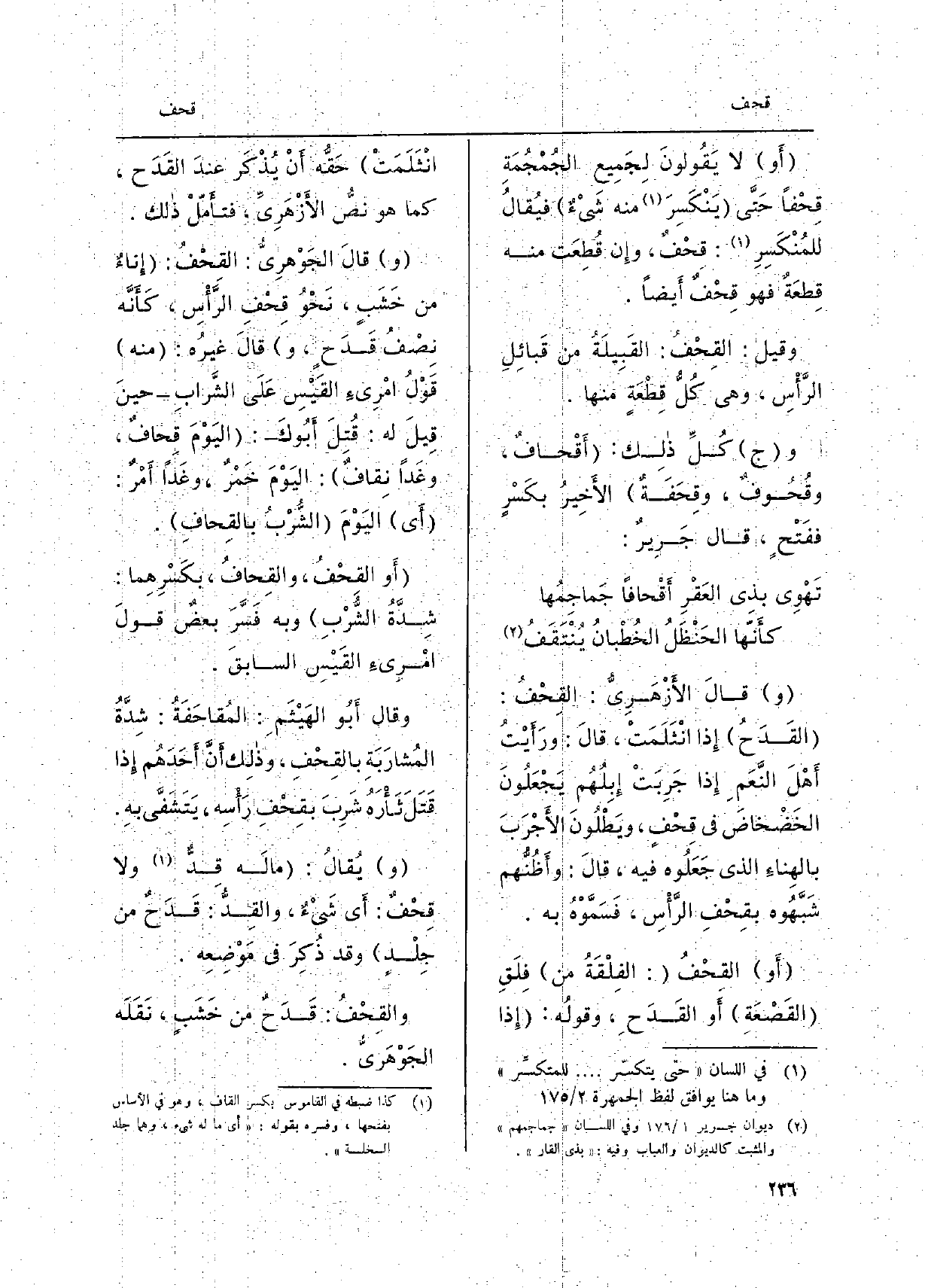 وَقَالَ الأَزْهَرِيُّ: القِحْفُ: القَدَحُ إِذا انْثَلَمَتْ، قالَ: ورَأَيْتُ أَهْلَ النَّعَمِ إِذا جَرِبَتْ إِبِلُهُم يَجْعَلُونَ الخَضْخاضَ فِي قِحْفٍ، ويَطْلُونَ الأَجْرَبَ بالهِناءِ الَّذِي جَعَلُوه فِيهِ، قالَ: وأَظُنُّهم شَبَّهُوه بقِحْفِ الرَّأْسِ، فَسَمَّوْهُ بِهِ. أَو القحْفُ: الفِلْقَةُ من فِلَقِ القَصْعَةِ أَو القَدَحِ، وقولُه: إِذا انْثَلَمَتْ حَقُّه أَنْ يُذْكَر عندَ القدَح، كَمَا هُوَ نصُّ الأَزْهَرِيِّ، فتأَمّلْ ذَلِك. وَقَالَ الجَوْهرِيُّ: القِحْفُ: إِناءُ من خَشَبٍ، نَحْوُ قِحْفِ الرَّأْسِ، كَأَنَّه نِصْفُ قَدَحٍ، وَقَالَ غيرُه: مِنْهُ قَوْلُ امْرِئِ القَيْسِ على الشَّرابِ حِين قيل لَهُ:)