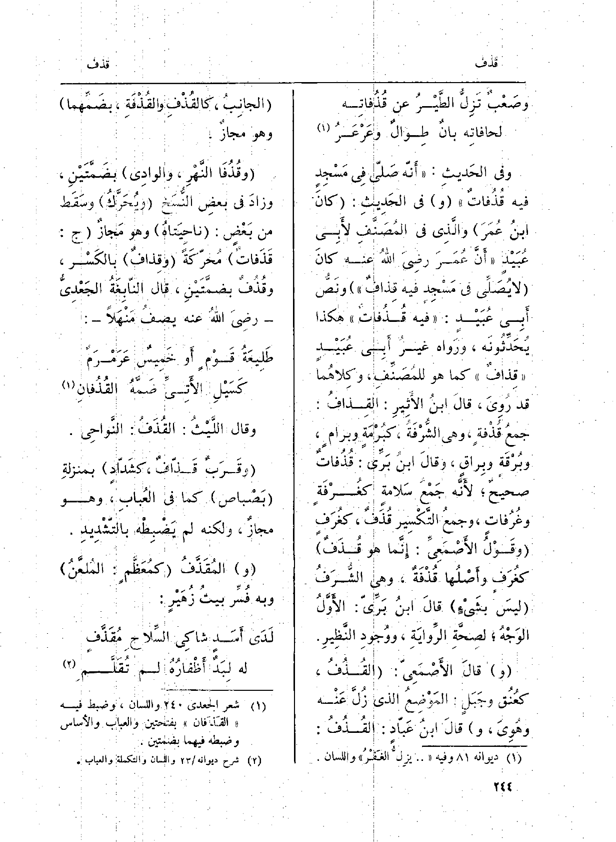لأَبِي عُبَيْدٍ أَنَّ عُمَرَ رضِيَ اللهُ عَنهُ كانَ لَا يُصَلِّي فِي مَسْجِدِ فِيهِ قِذافٌ، ونَصُّ أَبِي عُبَيْدٍ: فِيهِ قُذُفاتُ هَكَذَا يُحَدِّثُونَه، ورَواه غيرُ أَبِي عُبَيْدٍ قِذافٌ كَمَا هُوَ للمُصَنِّفِ، وكِلاهُما قد رُوِيَ، قالَ ابنُ الأَثِيرِ: القِذافُ: جمعُ قُذْفةٍ، وَهِي الشُّرْفَةُ، كبُرْمَةٍ وبرامٍ، وبُرْقَةٍ وبِراقٍ، وقالَ ابنُ بَرِّي: قُذُفاتٌ صحيحٌ لأَنَّه جَمْعُ سَلامةٍ كغُرْفَةٍ وغُرُفاتٍ، وجمعُ التَّكْسِير قُذَفٌ، كغُرَفٍ وقَوْلُ الأَصْمَعِيِّ: إِنَّما هُوَ قُذَفٌ كغُرَفٍ وأَصْلُها قُذْفَةٌ، وَهِي الشُّرَفُ ليسَ بشَيْءٍ قالَ ابنُ بَرِّيّ: الأَوَّلُ الوَجْهُ لصِحَّةِ الرِّوايَةِ، ووُجودِ النَّظِيرِ. وقالَ الأَصْمَعِيّ: القُذُفُ، كعُنُق وجَبَلٍ: المَوْضِعُ الَّذِي زُلَّ عَنْه وهُوِىَ، وَقَالَ ابنُ عَبّادٍ: القُذُفُ: الجانِبُ، كالقُذْفِ والقُذْفَةِ، بضَمِّهما وَهُوَ مجازٌ. وقُذُفَا النَّهْرِ، والوادِي بضَمَّتَيْنِ، وزادَ فِي بعضِ النُّسَخ ويُحَرَّكُ وسَقَط من بَعْضٍ: ناحِيَتاهُ وَهُوَ مَجازٌ ج: قَذَفاتٌ مُحرّكَةً وقِذافٌ بالكَسْر، وقُذُفٌ بضمَّتَيْنِ، قَالَ النّابِغَةُ الجَعْدِيِّ رضِيَ اللهُ عَنهُ يصفُ مَنْهَلاَ: