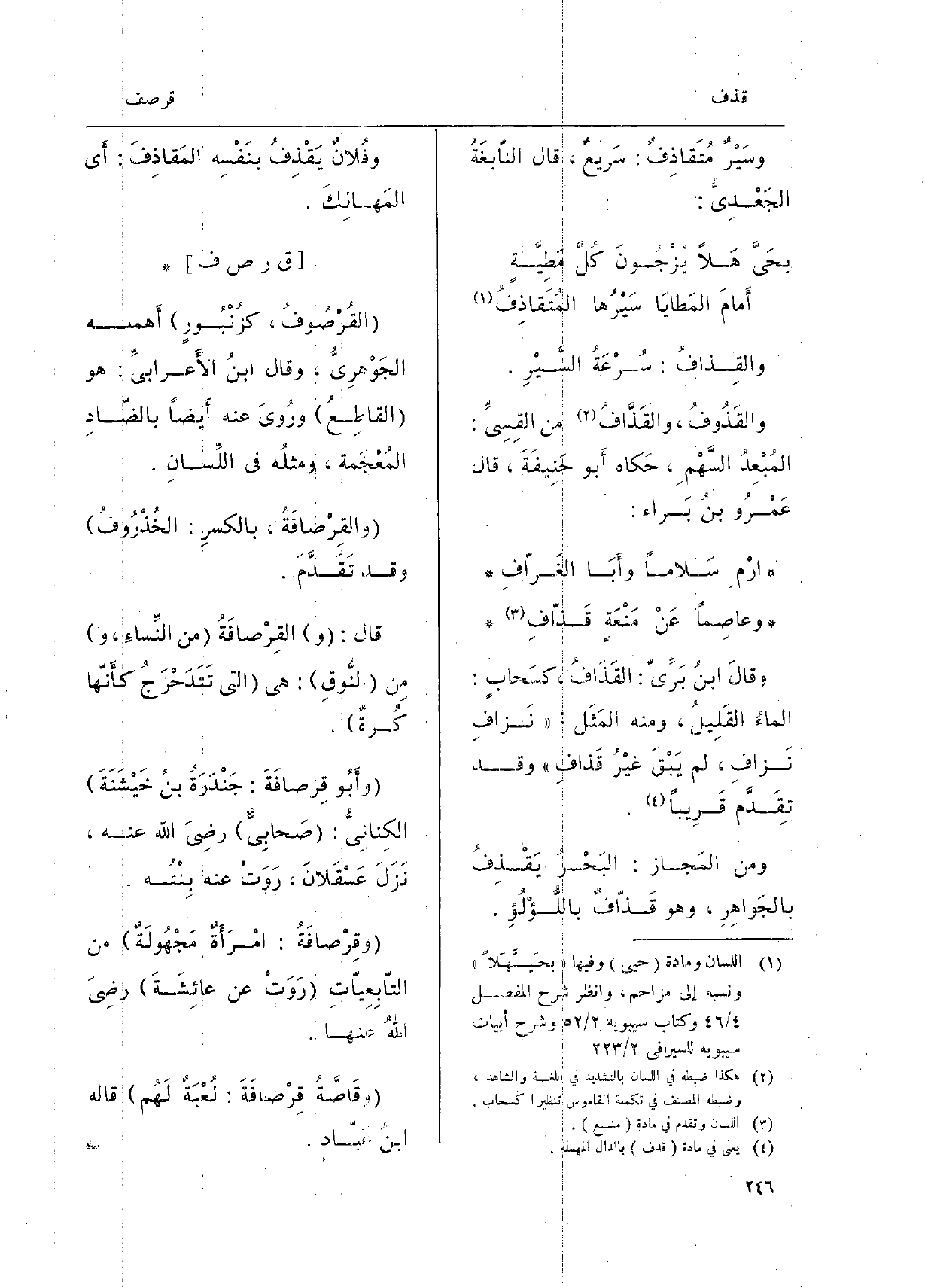 القُرْصُوفُ، كزُنْبُورٍ أَهمله الجَوْهرِيُّ، وَقَالَ ابنُ الأعرابيِّ: وَهُوَ القاطِعُ ورُوىَ عَنهُ أَيضاً بالضّادِ المُعْجَمة، ومثلُه فِي اللِّسانِ. والقِرْصافَةُ، بالكسرِ: الخُذْرُوفُ وَقد تَقَدَّمَ. قَالَ: والقِرْصافَةُ من النِّساءِ، ومِن النُّوقِ: هِيَ الَّتِي تَتَدَحْرَجُ كأَنّها كُرةٌ. وأَبُو قِرصَافَةَ: جَنْدَرَةُ بنُ خَيْشَنَةَ الكِنانِيُّ: صَحابِيٌّ رضِيَ الله عَنهُ، نَزَلَ عَسْقلانَ، رَوَتْ عَنهُ بِنْتُه. وقِرْصافَةُ: امْرَأَةٌ مَجْهُولَةٌ من التّابِعِيّاتِ رَوَتْ عَن عائِشَةَ رضِي اللهُ عَنْهَا. وقَاصَّهُ قِرْصافَةَ: لُعْبَةٌ لَهُم قَالَه ابنُ عَبّادٍ.