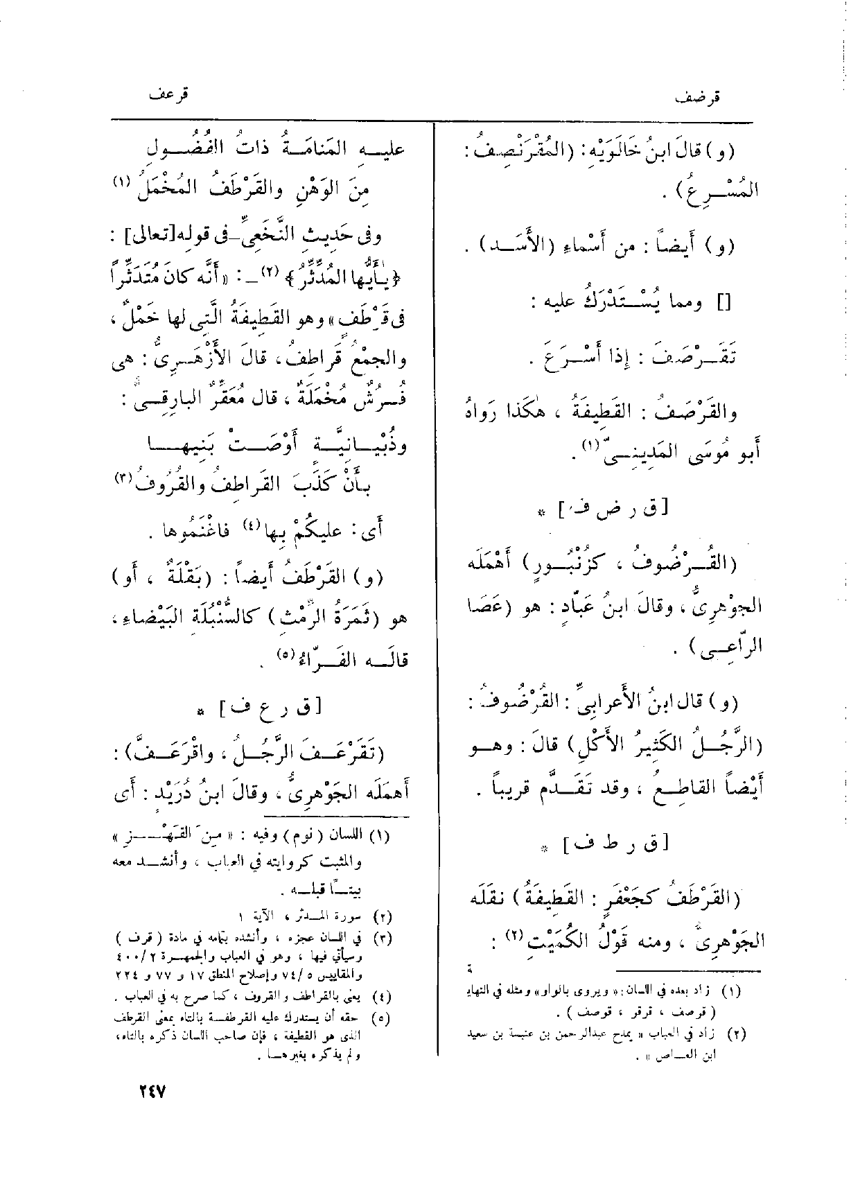 وقالَ ابنُ خَالَوَيْهِ: المُقْرَنْصِفُ: المُسْرِعُ. وأَيضاً: من أَسْماءِ الأَسَد.