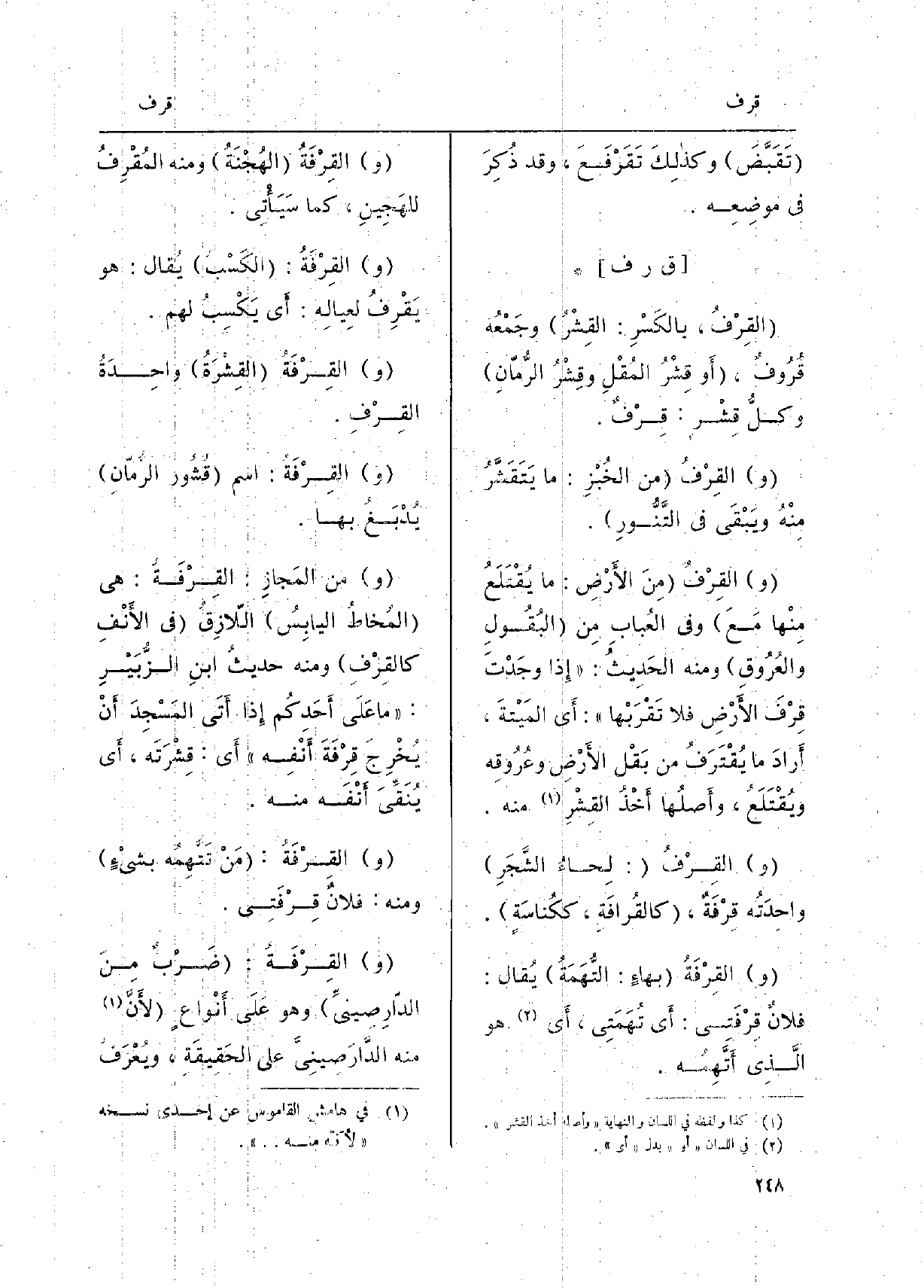 القِرْفُ، بالكَسْرِ: القِشْرُ وجَمْعُه قُرُوفٌ، أَو قِشْرُ المُقْلِ وقِشْرُ الرُّمّانِ وكلُّ قِشْرٍ: قِرْفٌ. والقِرْفُ من الخُبْزِ: مَا يَتَقَشَّرُ مِنْهُ ويَبْقَى فِي التَّنُّورِ. والقِرْفُ مِنَ الأَرْضِ: مَا يُقْتَلَعُ مِنْها مَعَ وَفِي العُبابِ مِن البُقُولِ والعًرُوقِ وَمِنْه الحَدِيثُ: إِذا وجَدْتَ قِرْفَ الأَرْضِ فَلَا تَقْرَبْها: أَي المَيْتةَ، أَرادَ مَا يُقْتَرَفُ من بَقْل الأَرْضِ وعُرُوقِه ويُقْتَلَعُ، وأَصلُها أَخْذُ القِشْرِ مِنْهُ. والقِرْفُ: لِحاءُ الشَّجَرِ واحِدَتُه قِرْفَةٌ، كالقُرافَةِ، ككُناسَةٍ. والقِرْفَةُ بهاءٍ: التُّهَمَةُ يُقال فلانٌ قِرْفَتِي: أَي تُهَمَتِي، أَي هُوَ الَّذِي أَتَّهِمُه. والقِرْفَةُ الهُجْنَةُ وَمِنْه المُقْرِفُ للهَجِينِ، كَمَا سَيَأْتِي. والقِْفَةُ: الكَسْبُ يُقال: هُوَ يَقْرِفُ لِعيالِه: أَي يَكْسِبُ لَهُم. والقِرْفَةُ القِشْرَةُ واحِدَةً القِرْفِ. والقِرْفَةُ: اسْم قُشُور الرُّمّانِ يُدْبَغُ بهَا.