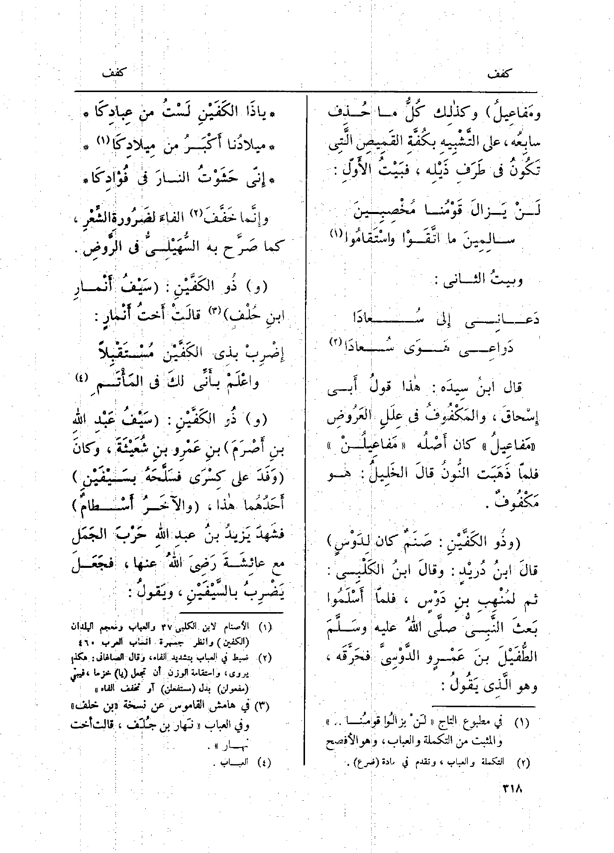 قَالَ ابنُ سِيدَه: هَذَا قولُ أَبي إِسْحاقَ، والمَكْفُوفُ فِي عِلَلٍ العَرُوضِ مَفاعِيلُ كَانَ أَصْلُه مَفاعِيلُنْ فَلَمَّا ذَهَبَت النُّونُ قالَ الخَلِيلُ: هُوَ} مَكْفُوفٌ. وذُو {الكَفَّيْنِ: صَنَمٌ كَانَ لِدَوْسٍ قالَ ابنُ دُريْدٍ: وقالَ ابنُ الكَلْبِي: ثمَّ لمُنْهِبِ بنِ دُوْسٍ، فلمّا أَسْلَمُوا بَعثَ النَّبِيُّ صلى الله عَلَيْهِ وَسلم الطُّفَيْلَ بنَ عَمْرٍ والدَّوْسِيَّ فحَرَّقَه، وَهُوَ الَّذِي يَقُولُ: يَا ذَا} الكَفَيْنِ لَسْتُ من عِبادِكَا ميلادُنا أَكْبَرُ من مِيلادِكَا إِنّي حَشَوْتُ النارَ فِي فُؤادِكَا وإنّما خَفَّفَ الفاءَ لضرُورةِ الشِّعْرِ، كَمَا صَرَّح بِهِ السُّهَيْلِيُّ فِي الرَّوضِ. وذَو الكَفَّيْنِ: سَيْفُ أَنْمارِ ابنِ حُلْفِ قالَتْ أَختُ أَنْمارٍ:
