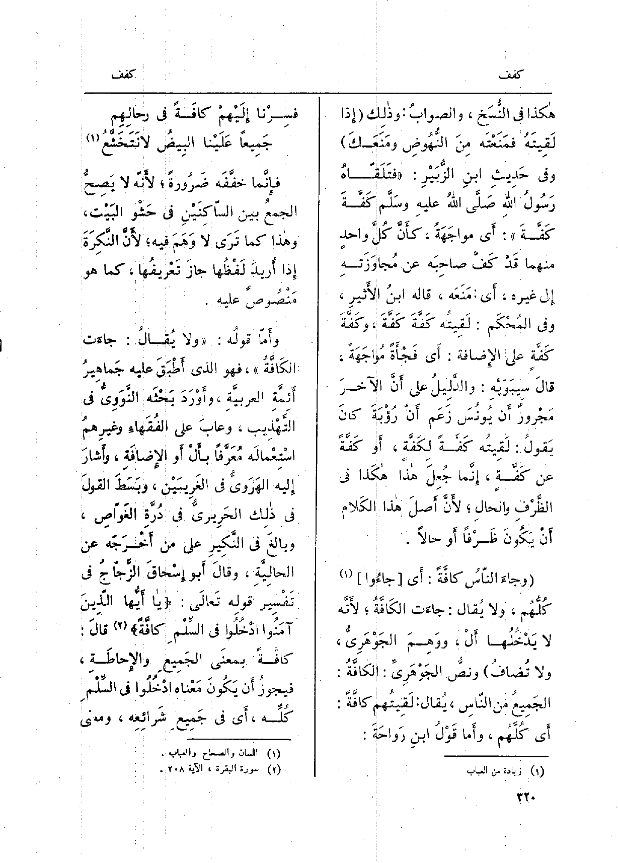فإِنَّما خفَّفَه ضَرُورةً لأَنَّه لَا يَصْحُّ الجمعُ بَين السّاكِنَيْنِ فِي حَشْو البَيْت، وَهَذَا كَمَا تَرىَ لَا وَهَمَ فِيهِ، لأَنَّ النَّكِرَةَ إِذا أُريدَ لَفْظُها جازَ تَعريفُها، كَمَا هُوَ مَنْصُوصٌ عَلَيْهِ. وأَما قولُه: وَلَا يُقالً: جاءَت الكَافَّةُ، فَهُوَ الَّذِي أَطْبَقَ عَلَيْهِ جَماهِيرُ أَئِمَّةِ العربيَّةِ، وأَوْرَدَ بَحْثَه النَّوَوِيُّ فِي التَّهْذِيب، وعابَ على الفُقَهاءِ وغيرهُم اسْتِعْمالَه مُعَرَّفاً بأَلْ أَو الإِضافَةِ، وأَشارَ إِلَيْهِ الهَرَويُّ فِي الغَرِيبَيْن، وبسَطَ القولَ فِي ذَلِك الحَرِيريُّ فِي دُرَّةِ الغَوّاصِ، وبالغَ فِي النَّكِيرِ على من أَخْرَجَه عَن الحالِيَّةِ، وقالَ أَبو إِسحاقَ الزَّجاجُ فِي تَفْسِير قَوْله تَعالى: يَا أَيُّها الَّذِينَ آمَنُوا ادْخُلُوا فِي السِّلْمِ كافَّةً قالَ: كافَّةً بمعنَى الجَمِيعِ والإِحاطَةِ، فيجوزُ أَن يَكُونَ مَعنْاه ادْخُلُوا فِي السِّلْمِ كُلِّه، أَي فِي جَمِيعِ شَرائِعِه، وَمعنى