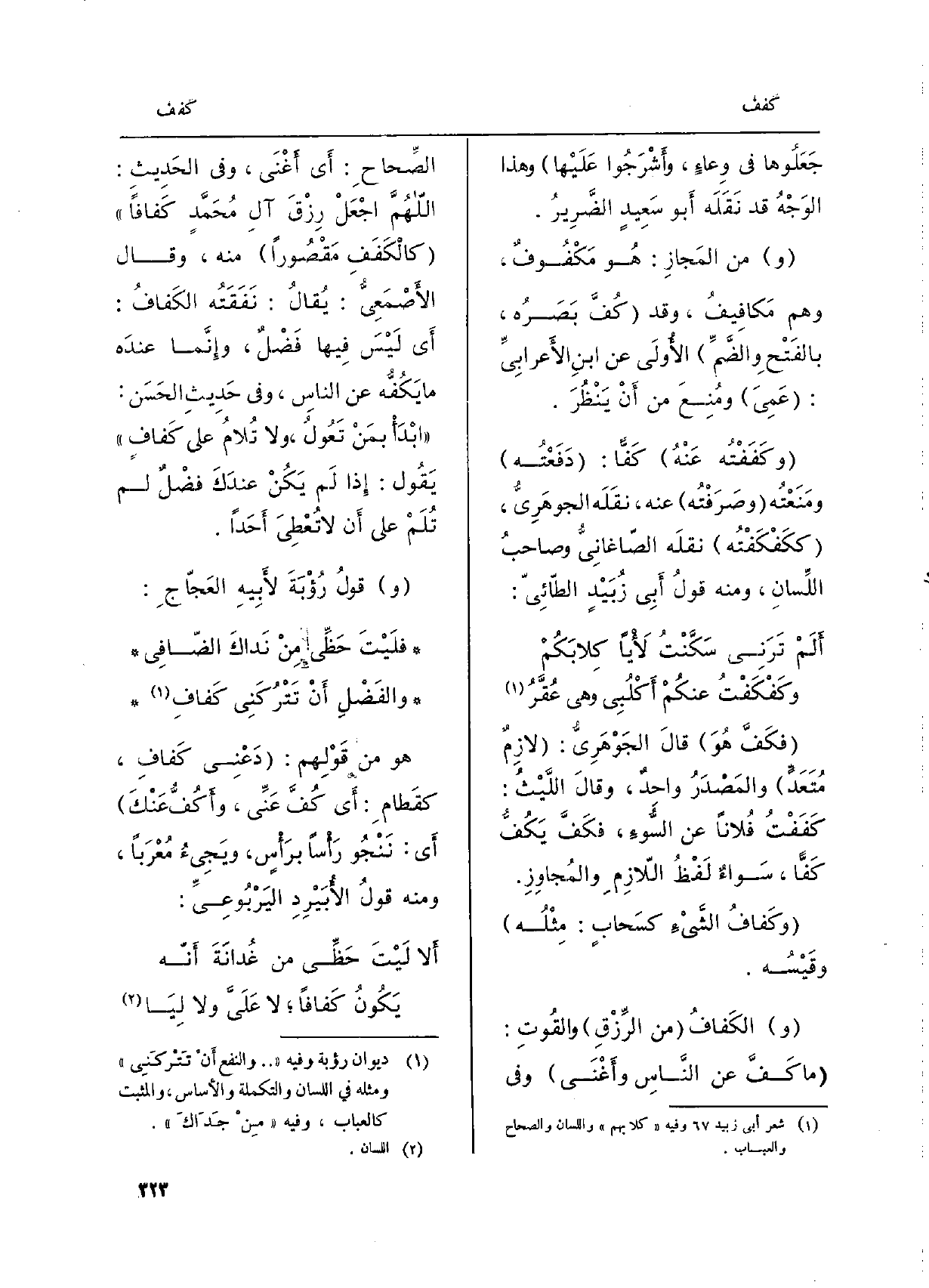 الرِّزْقِ والقُوتِ: مَا كَفَّ عَن النَّاسِ وأَغْنَى وَفِي الصِّحاحِ: أَي أَغْنى، وَفِي الحديثِ: اللهُمَّ اجْعَلْ رِزْقَ آلِ مُحَمَّدٍ كَفافاً {كالْكَفَفِ مَقْصُوراً، مِنْهُ، وَقَالَ الأَصْمَعِيُّ: يُقالُ: نَفَقَتُه الكَفافُ: أَي لَيْسَ فِيها فَضْلٌ، وإِنَّما عندَه مَا} يَكُفُّه عَن الناسِ، وَفِي حدِيُثِ الحَسَن: ابْدَأْ بمَنْ تَعُولُ، وَلَا تُلامُ على {كَفافٍ يَقول: إِذا لم يكُنْ عندَك فضْلٌ لم تُلَمْ على أَن لَا تُعْطِيَ أَحَداً. وقولُ رُؤْبَةَ لأَبيهِ العَجّاجِ: فلَيْتَ حَظِّي مِنْ نَداكَ الضّافِي والفَضْلِ أَنْ تَتْرُكَنِي كَفافِ هُوَ من قَوْلِهم: دَعْنِي كَفافِ، كقَطامِ: أَي كُفَّ عَنِّي،} وأَكُفُّ عَنْكَ أَي: نَنْجُو رَأْساً برَأْسٍ، يَجِيءُ مُعْرَباً، وَمِنْه قولُ الأُبَيْرِدِ اليَرْبُوعِيِّ: