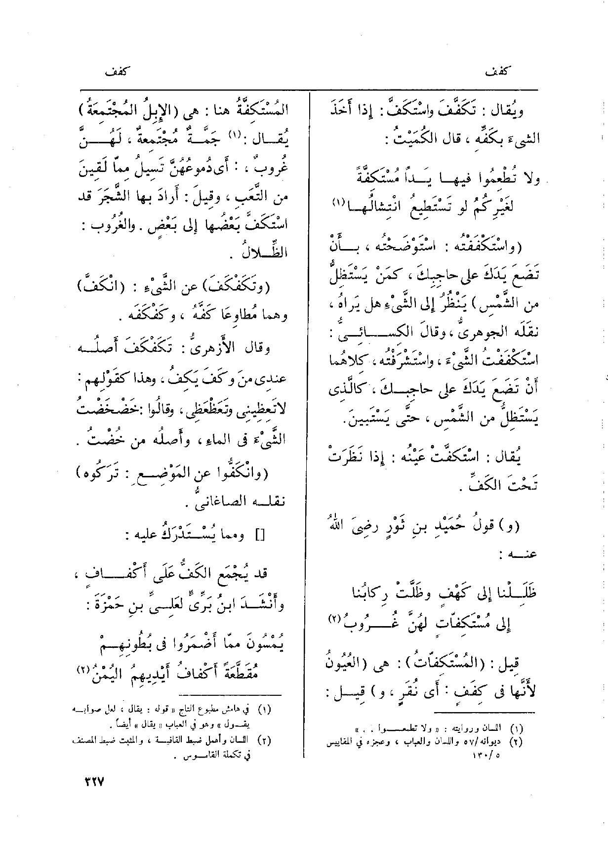 قِيل:} المُسْتَكِفّاتُ: هِيَ العُيُونُ لأَنَّها فِي {كِفَفٍ: أَي نُقَرٍ، وقِيل:} المُسْتَكِفَّةُ هُنَا: هِيَ الإِبِلُ المُجْتَمِعَةُ يُقال: جَمَّةٌ مُجْتَمِعةٌ، لَهُنَّ غُروبٌ: أَي دُموعُهُنَّ تَسِيلُ مِمّا لَقِينَ من التَّعَبِ، وقِيلَ: أَرادَ بهَا الشَّجَرَ قد اسْتَكَفَّ بَعْضُها إِلَى بَعْضٍ. والغُرُوب: الظِّلالُ. {وتَكَفْكَفَ عَن الشَّيْءِ:} انْكَفَّ وهما مُطاوِعَا كَفَّهُ، {وكَفْكَفَه. وَقَالَ الأَزهريُّ:} تَكَفْكَفَ أَصلُه عندِي منَ {وكَفَ} يَكِفُ، وَهَذَا كقَوْلِهم: لَا تَعِظِينِي وتَعَظْعْظِي، وقالُوا: خَضْخَضْتُ الشَّيْءَ فِي الماءِ، وأَصلُه من خُضْتُ. {وانْكَفُّوا عَن المَوْضِعِ: تَرَكُوه نقَله الصاغانيُّ.