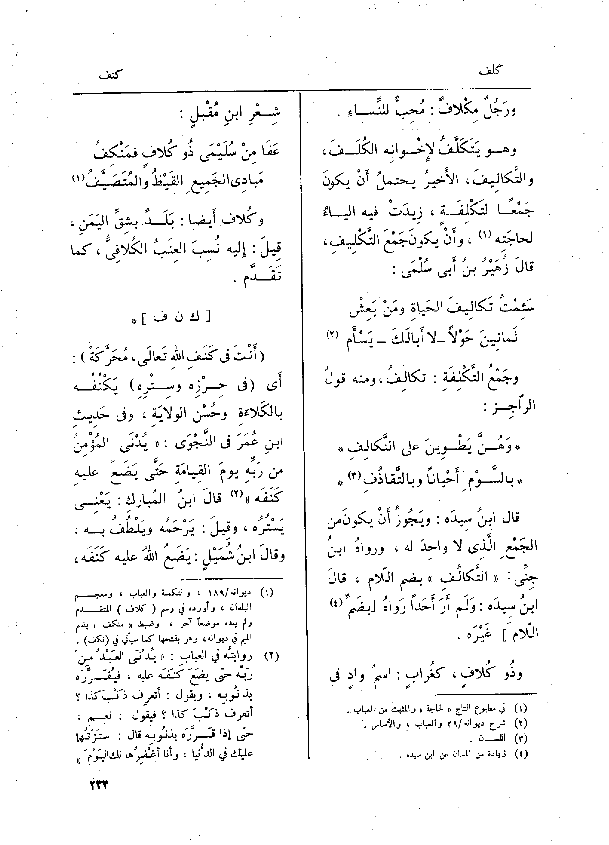 وجمْعُ التَّكْلِفَةِ: تكالِفُ، وَمِنْه قولُ الراجِ: وَهُنَّ يَطْوِينَ على التَّكالِفِ وبالسَّوْمِ أَحْياناً وبالتَّقاذُفِ قَالَ ابنُ سِيدَه: ويَجُوزُ أَنْ يكون من الجَمْعِ الَّذِي لَا واحِدَ لَهُ، ورواهُ ابنُ جِنِّي: التَّكالُفِ بِضَم اللَّام، قالَ ابنُ سيدَه: وَلَمْ أَرَ أَحَداً رَواهُ بضمِّ اللامَ غيرَه. وذُو كُلافٍ، كغُرابٍ: اسمُ وادٍ فِي شِعْرِ مُقْبِلٍ:)