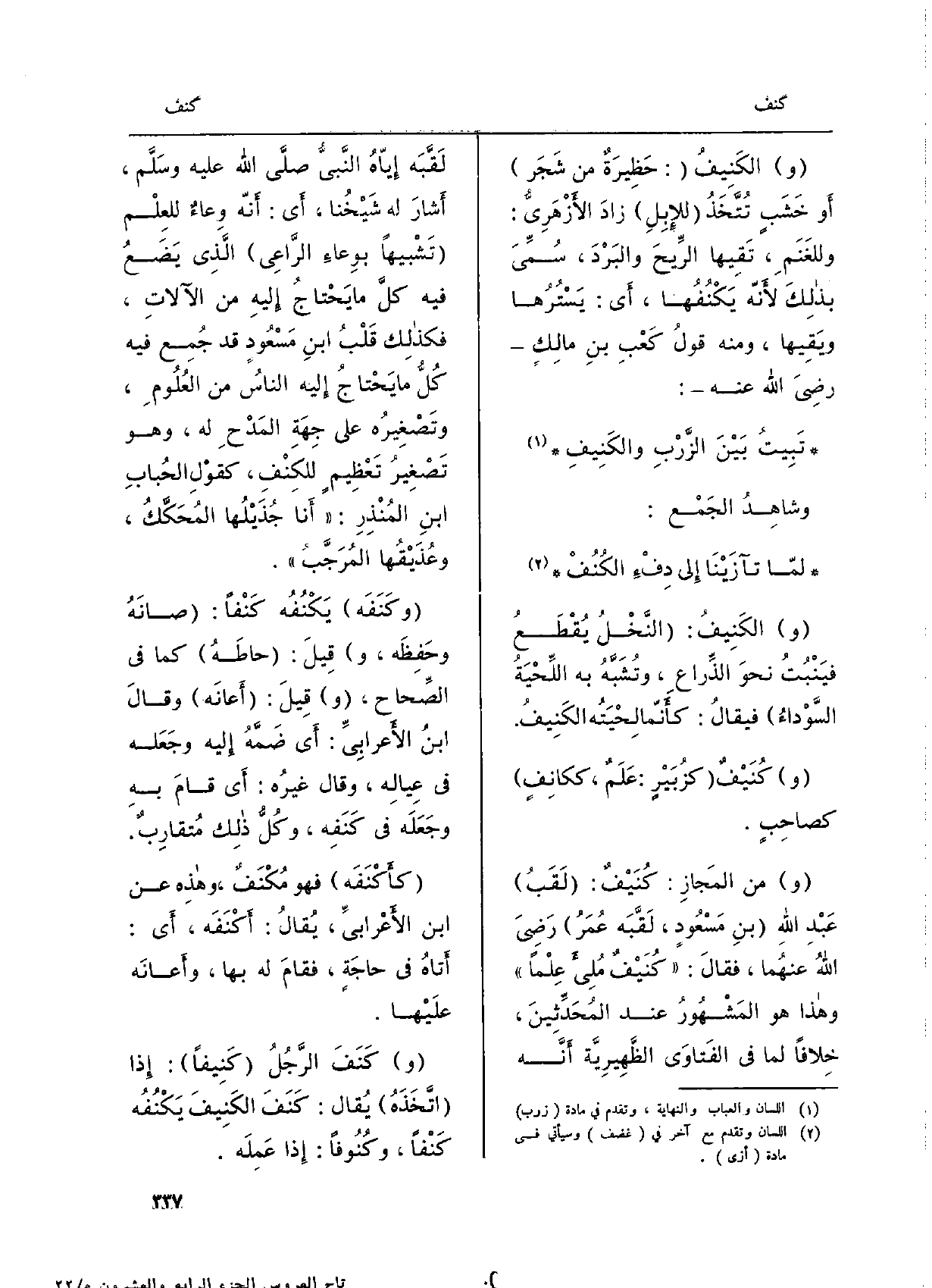 وكُنَيْفٌ كزُبَيْرٍ: عَلَمٌ، ككانِفٍ كصاحِبٍ. وَمن الْمجَاز: كُنَيْفٌ: لقَبُ عبد اللهِ بنِ مَسْعُودٍ، لَقَّبَه عُمَرُ رضيَ الله عنهُما، فقالَ: كُنَيْفٌ مُلِئَ عِلْماً. وَهَذَا هُوَ المَشْهُورُ عِنْد الْمُحدثين، خلافًا لما فِي الفتاوَى الظَّهِيريَّة أَنه لقَّبَه إيّاهُ النبيُّ صلى الله عَلَيْهِ وَسلم، أشارَ لَهُ شَيخنَا، أَي: أَنّه وِعاءٌ للعِلْم تَشْبيهاً بوِعاءِ الرَّاعي الَّذِي يَضَعُ فِيهِ كلَّ مَا يَحْتاجُ إليهِ من الآلاتِ، فَكَذَلِك قَلْبُ ابنِ مَسْعُودٍ قد جُمِع فِيهِ كُلُّ مَا يَحْتاجُ إِلَيْهِ الناسُ من العُلومِ، وتَصْغِيرُه على جِهَةِ المَدْحِ لَهُ، وَهُوَ تَصْغِيرُ تَعظِيمٍ للكِنْفٍِ، كقولِ الحُبابِ ابنِ المُنْذِرِ: أَنا جُذَيْلُها المُحَكَّكُ، وعُذَيْقُها المُرَجَّبُ. وكَنَفَه يَكْنُفُه كَنْفاً: صانَهُ وحَفِظَه، وقِيلَ: حاطَهُ كَمَا فِي الصِّحاح، وقِيلَ: أَعانَه وقالَ ابنُ الأعرابيِّ: أَي ضَمَّهُ إِلَيْهِ وجَعَله فِي عِيالِه، وَقَالَ غيرُه: أَي قامَ بهِ وجعَلَه فِي كَنَفِه، وكُلُّ ذَلِك مُتقارِبٌ. كأَكْنَفَه فَهُوَ مُكْنَفٌ، وهذهِ عَن ابْن الْأَعرَابِي، يُقالُ: أَكْنَفَه، أَي: أَتاهُ فِي حاجَةٍِ، فقامَ لَهُ بهَا، وأعانه عَلَيْهَا. وكَنَفَ الرَّجُلُ كَنِيفاً: إِذا اتَّخَذَهُ يُقال: كَنَفَ الكَنيفَ يَكْنُفُه كَنْفاً، وكُنُوفاً: إِذا عَمِلَه.