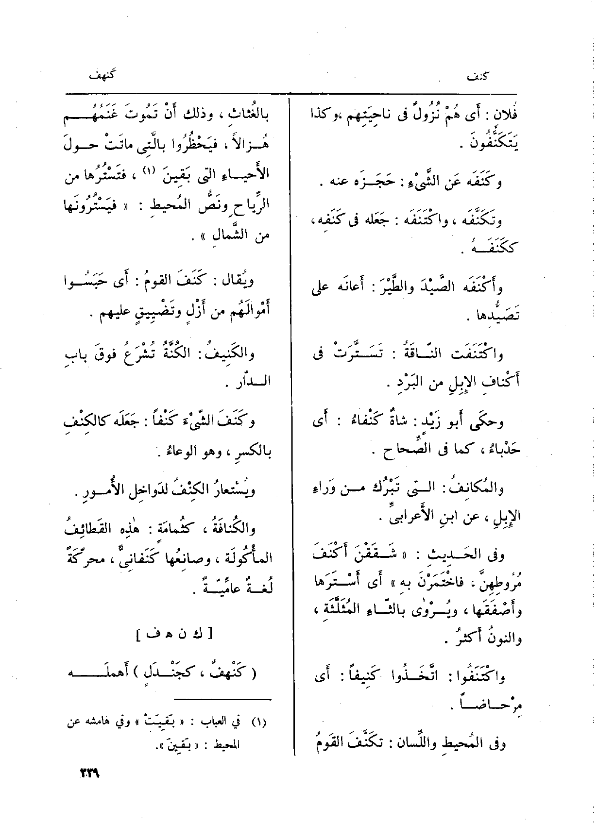 فلانٍ: أَي هُمْ نُزُولٌ فِي ناحِيَتِهم، وَكَذَا يَتَكَنَّفُونَ. وكَنَفَه عَن الشَّيْءِ: حَجَزَه عَنهُ. وتَكَنَّفَه، واْكْتَنَفَه: جَعَله فِي كَنَفِه، ككنَفَهُ. وأَكْنَفَه الصَّيْدَ والطَّيْرَ: أَعانَه على تَصَيَّدِها. واكْتَنَفَت النّاقَةُ: تَسَتَّرَتْ فِي أَكْنافِ الإِبِلِ من البَرْدِ. وحكَى أَبو زَيْدِ: شاةٌ كَنْفاءُ: أَي حَدْباءُ، كَمَا فِي الصِّحاح. والمُكانِفُ: الَّتِي تَبْرُك من وَراءِ الإِبلِ، عَن ابنِ الأعرابيِّ. وَفِي الحديثِ: شَقَقْنَ أَكْنَفَ مُروطِهِنَّ، فاخْتَمَرْنَ بهِ أَي أَسْتَرَها وأَصْفَقَها، ويُرْوى بالثّاءِ المُثَلَّثَةِ، والنونُ أَكثرُ. واكْتَنَفُوا: اتَّخَذُوا كَنِيفاً: أَي مرْحاضاً. وَفِي المُحِيطِ واللِّسان: تَكَنَّفَ القَومُ بالغُثاءِ، وَذَلِكَ أَنْ تَمُوتَ غَنَمُهُم هُزالاً، فيحْظُرُوا بالَّتِي ماتَتْ حولَ الأَحياءِ الَّتِي بقِينَ، فتَسْتُرُها من الرِّياحِ ونَصُّ المُحيطِ: فيَسْتُرُونَها من الشَّمالِ ويُقال: كَنَفَ القومُ: أَي حَبَسُوا أَمْوالَهُم من أَزْلٍ وتَضْيِيقٍ عَلَيْهِم. والكَنِيفُ: الكُنَّةُ تُشْرَعُ فوقَ بابِ الدّار. وكَنَفَ الشَّيءَ كَنْفاً: جَعَلَه كالكنْفِ بالكسرِ، وَهُوَ الْوِعَاء. ويُسْتعارُ الكِنْفُ لدَواخِل الأَمورِ. والكُنافَةُ، كثُمامَةٍ: هَذِه القَطائِفُ المَأْكُولَة، وصانِعُها كَنَفانِيٌّ، محرَّكَةً لُغَةٌ عامِّيّةٌ.