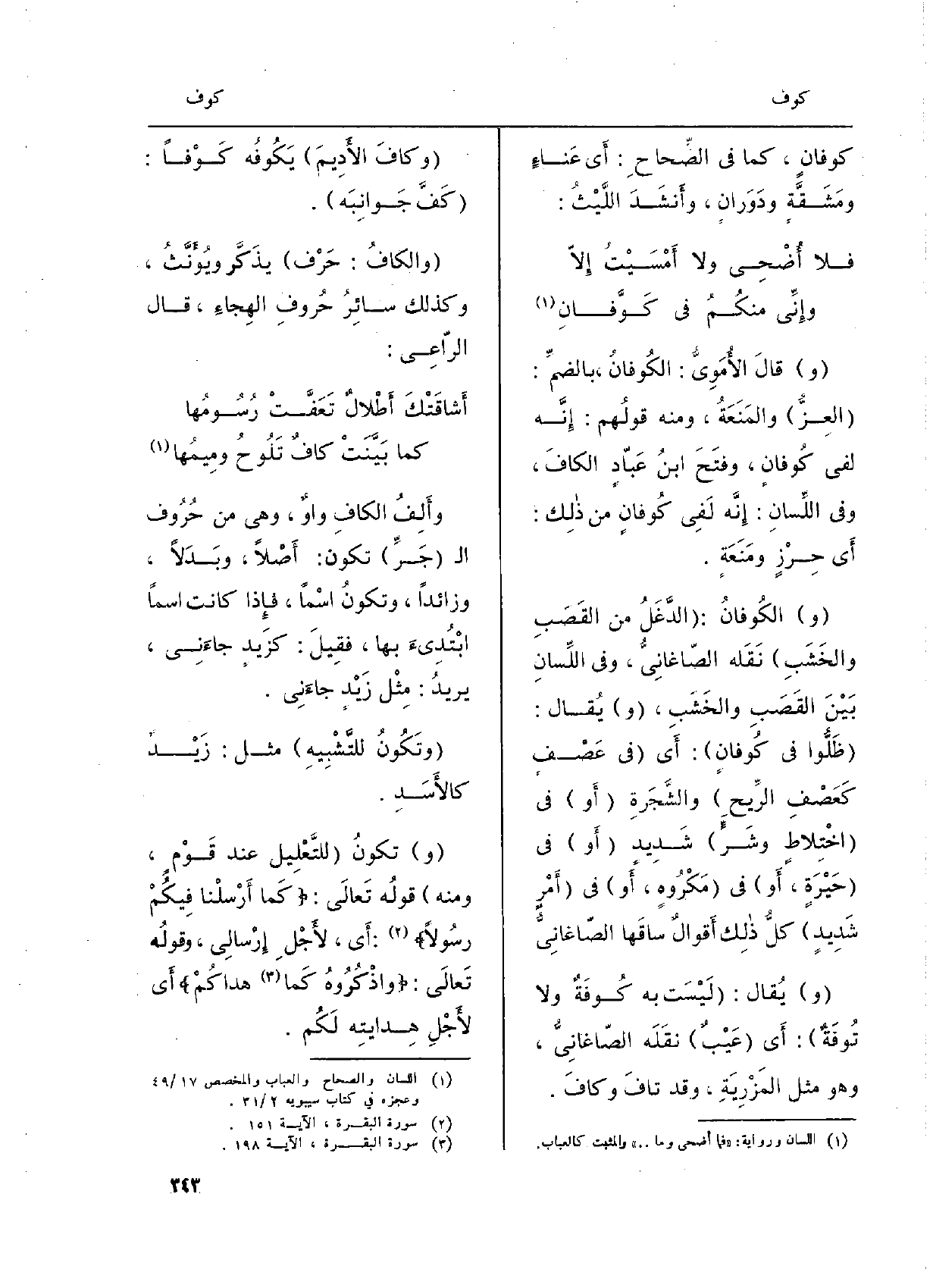 وأَلِفُ الكافِ واوٌ، وَهِي من حُرُوف الجَرِّ تكون: أًصْلاُ، وبَدَلاً، وزائداً، وتكونُ اسْماً، فَإِذا كَانَت اسْما ابْتُدِئَ بهَا، فقيلَ: كزَيدٍ جاءَنِي، يريدُ: مِثْل زَيْدٍ جاءَنِي. وتَكُونُ لتَّشْبِيهِ مثل: زَيْدٌ كالأسَدِ. وتكونُ للتَّعْلِيل عِنْد قوْمٍ، وَمِنْه قولُه تَعَالَى: كَمَا أرْسلْنا فيكُمْ رسُولاً أَي، لأَجْلِ إِرْسالِي، وقولُه تَعالَى: واذْكُرُوهُ كَما هَداكُمْ أَي لأجل هدايتِه لكم.