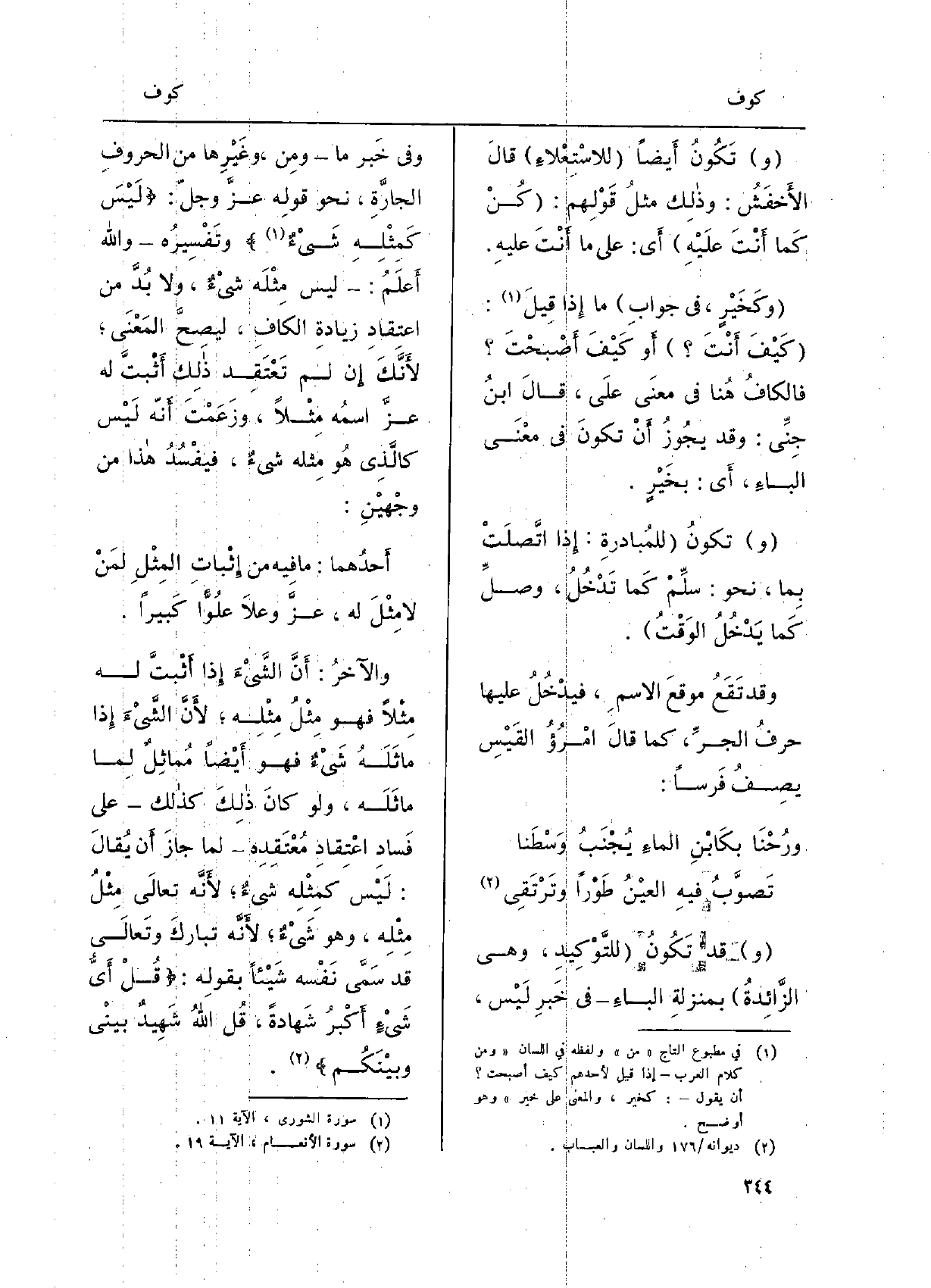 وَقد تكونُ للتَّوْكِيدِ، وَهِي الزَّائِدةُ بمنزلةِ الْبَاء فِي خَبرِ لَيْس، وَفِي خَبر مَا ومِن، وغَيرِها من الحروفِ الجارَّةِ، نَحْو قولِه عزَّ وجلَّ: لَيْسَ وَفِي خَبر مَا ومِن، وغَيْرِها م الحروفِ الجارَّةِ، نَحْو قولهِ عز وجلّ: لَيْسَ كَمِثْلِه شَيءٌ وتَفْسِيرهُ وَالله أعلم لَيْسَ مِثْلَه شيءٌ، وَلَا بدَّ من اعتقادِ زيادةِ الْكَاف، ليصحَّ المَعْنَى، لأَنَّكَ إِن لم تَعْتَقِد ذلِك أَثْبتَّ لَهُ عزَّ اسمُه مِثْلاً، وزَعَمْتَ أَنّه لَيْس كالَّذِي هُو مِثله شيءٌ، فيفْسُدُ هَذَا من وجْهَيْنِ: أَحدهمَا: مَا فِيهِ من إِثْباتِ المِثْلِ لمَنْ لَا مِثْلَ)