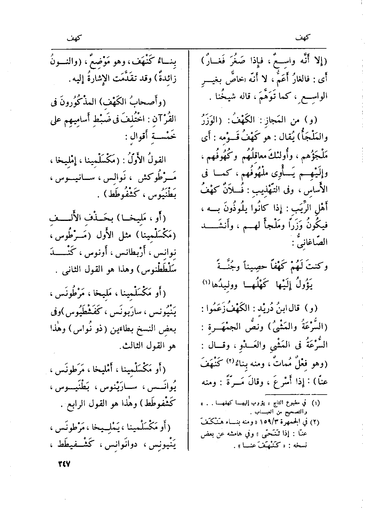 وَقَالَ ابنُ دُريْدٍ: الكَهْفُ زَعَمُوا السُّرْعَةُ والمَشْيُ ونصُّ الجمْهَرةِ: السُّرْعَةُ فِي المَشْيِ والعَدْوِ، وَقَالَ: وَهُوَ فِعْلٌ مُماتٌ، وَمِنْه بِناءُ كَنْهَفَ عنّا: إِذا أَسْرعَ، وقالَ مَرّةً: وَمِنْه بِناءُ كَنْهَف، وَهُوَ مَوْضِعٌ والنونُ زائِدةٌ وَقد تقَدَّمَت الإشارةُ إِليه. وأَصحابُ الكَهْفِ المذْكُوُرونَ فِي القُرْآنِ: اخْتُلِفَ فِي ضَبْطِ أَسامِيهِم على خَمْسةِ أَقوالِ: القولُ الأَوّلُ: مَكْسَلْمِينا، وإِمْلِيخا، مَرْطُوكش، نَوالِس، سانيوس، بَطْنَيُوس، كَشْفُوطط. أَو، مَلِيخا بحذْفِ الأَلفِ مَكْسَلْمِينا مثل الأَول مَرْطُوس، نِوانِس، أَرْبطانس، أَونوس، كَنْدَ سَلْطَطْنوس وَهَذَا هُوَ القَوْل الثَّانِي. أَو مَكْسَلْمِينا، مَلِيخا، مَرْطُونَس، يَنْيُونس، سارَبونَس، كَفَشْطَيُوس وَفِي بعضِ النّسخ بطاءَين ذُو نُواس وَهَذَا هُوَ القَوْل الثَّالِث. أَو مَكْسَلْمِينا، أَمْليخا، مَرَطونَس، يُوانَس، سارَيْنوس، بَطْنَيوس، كَشْفوطَط وَهَذَا هُوَ القَوْل الرَّابِع. أَو مَكْسَلْمينا، يَمْلِيخا، مَرْطونَس، يَنْيونِس، دوانَوانِس، كَشْفيطَط،