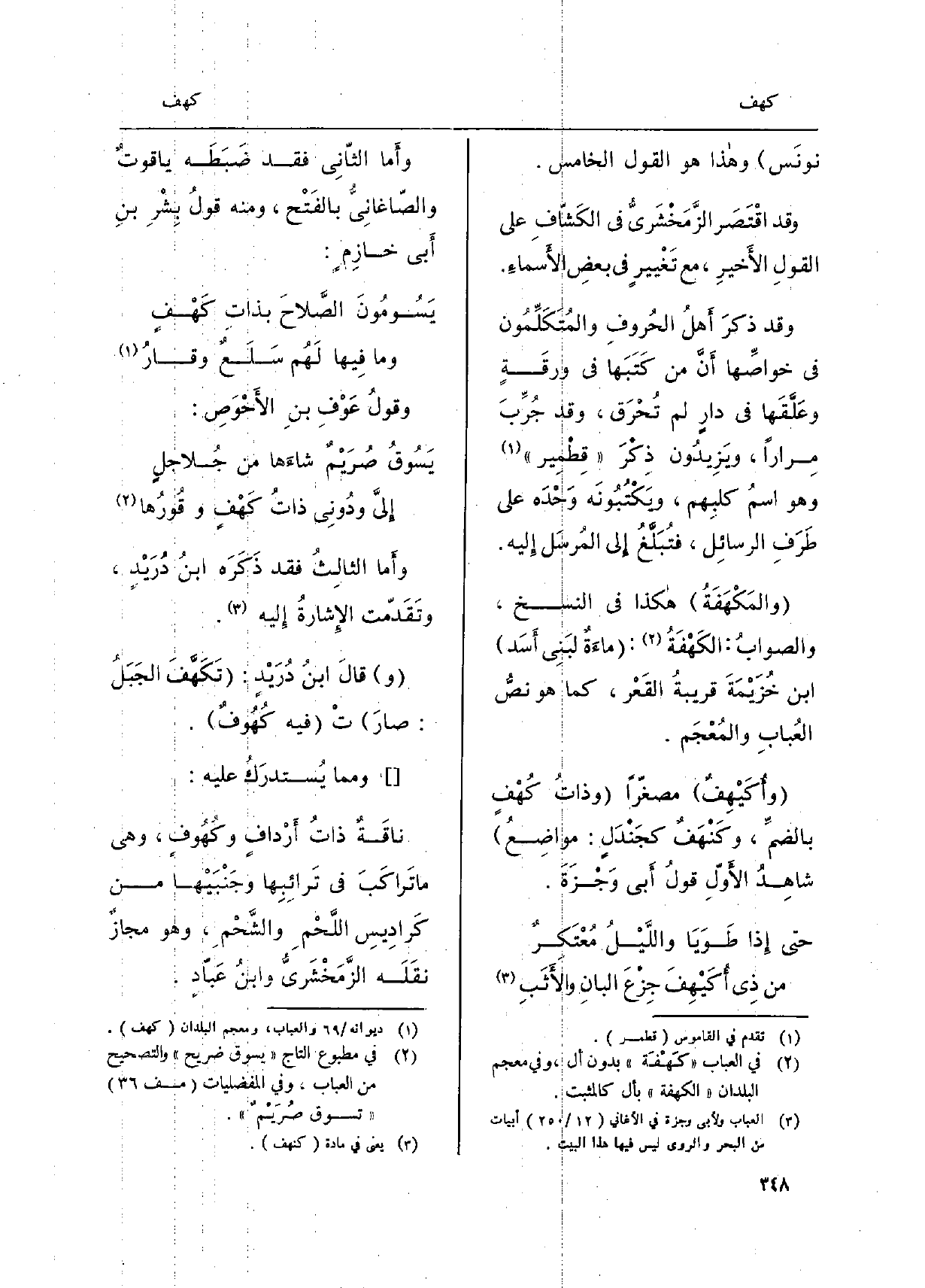 الكَشّافِ على القولِ الأَخيرِ، مَعَ تَغْييرٍ فِي بعضِ الأَسماءِ. وَقد ذكرَ أَهلُ الحُروفِ والمُتَكَلِّمُون فِي خواصِّها أَنَّ من كَتَبَها فِي ورقَةٍ وعَلَّقَها فِي دارٍ لم تُحْرَق، وَقد جُرِّبَ مِراراً، ويَزِيدُون ذِكْرَ قِطْمِير وَهُوَ اسمُ كلبِهم، ويَكْتُبُونَه وَحْدَه على طَرَفِ الرسائِل، فتُبَلَّغُ إِلَى المُرسَل إِليه. والمَكْهَفَةُ هَكَذَا فِي النّسخ، والصوابُ: الكَهْفَةُ: ماءةٌ لبَنِي أَسَد ابْن خُزَيْمَةَ قريبةُ القَعْر، كَمَا هُوَ نصُّ العُبابِ والمُعْجَم. وأُكَيْهِفٌ مصغّراً وذاتُ كُهْفٍ بالضمِّ، وكَنْهَفٌ كجَنْدَلٍ: مواضِعُ شاهِدُ الأَوّلِ قولُ أَبي وَجْزَةَ.