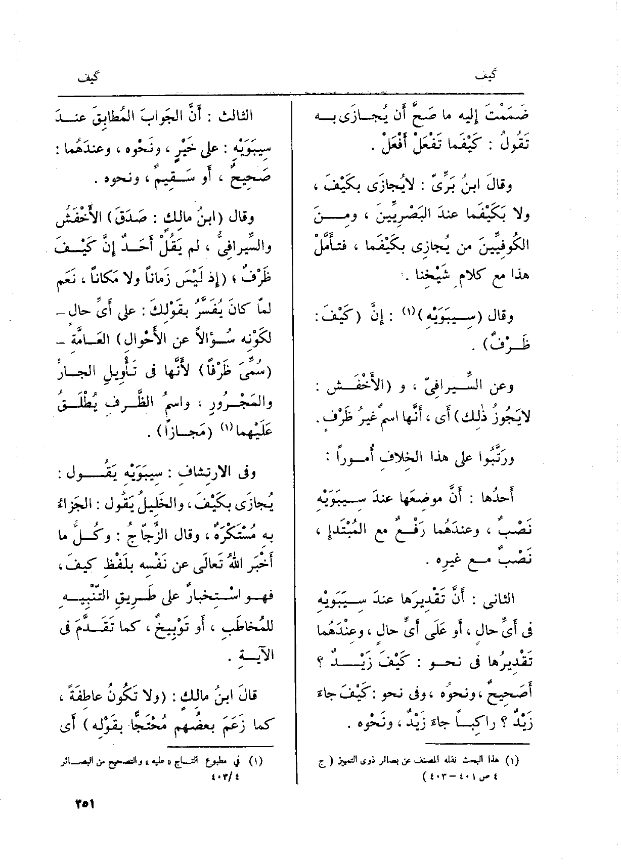 ضَممْتَ إِلَيْهِ مَا صَحَّ أَن يُجازَى بِهِ تَقُولُ: كَيْفَما تَفْعَلُ أَفْعَلْ. وَقَالَ ابنُ بَرِّيّ: لَا يُجازَى {بكَيْفَ، وَلَا} بَكَيْفما عندَ البَصْرِيِّينَ، ومِنَ الكُوفِيِّينَ من يُجازِي بكَيْفَما، فتَأَمَّلْ هَذَا مَعَ كلامِ شَيْخِنا. وَقَالَ سِيبَوَيْهِ: إِنَّ كَيْفَ: ظَرْفٌ. وَعَن السِّيرافِيّ، والأَخْفَش: لَا يَجُوزُ ذلِك أَي، أَنَّها اسمٌ غيرُ ظَرْفٍ.