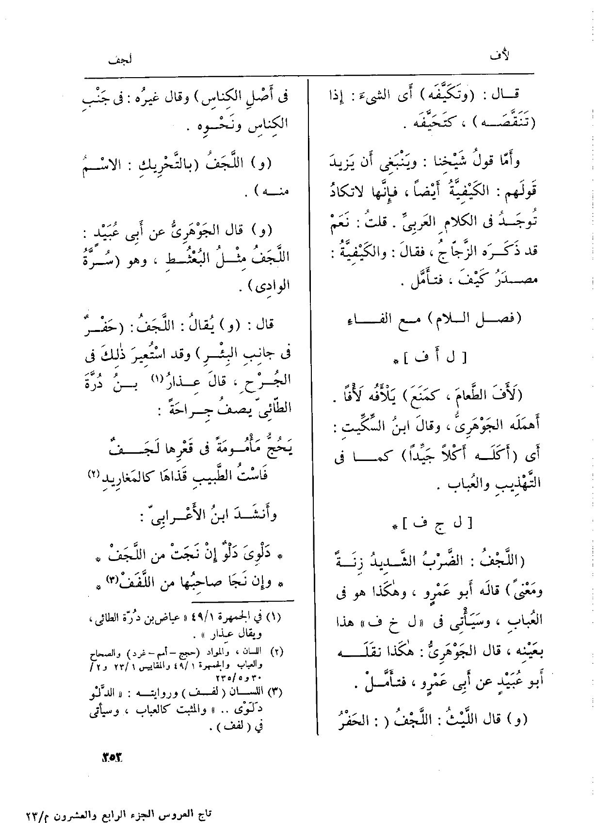 وَقَالَ الجَوْهَرِيُّ عَن أَبِي عُبَيْدٍ: اللَّجَفُ مِثْلُ البُعْثُطِ، وَهُوَ سُرَّةُ الوادِي. قَالَ: ويُقالُ: اللَّجَفُ: حَفْرٌ فِي جانِبِ البِئْرِ وَقد اسْتُعِيرَ ذلِكَ فِي الجُرْحِ، قالَ عِذارُ بنُ دُرَّةَ الطّائِيّ يصفُ جِراحَةً: