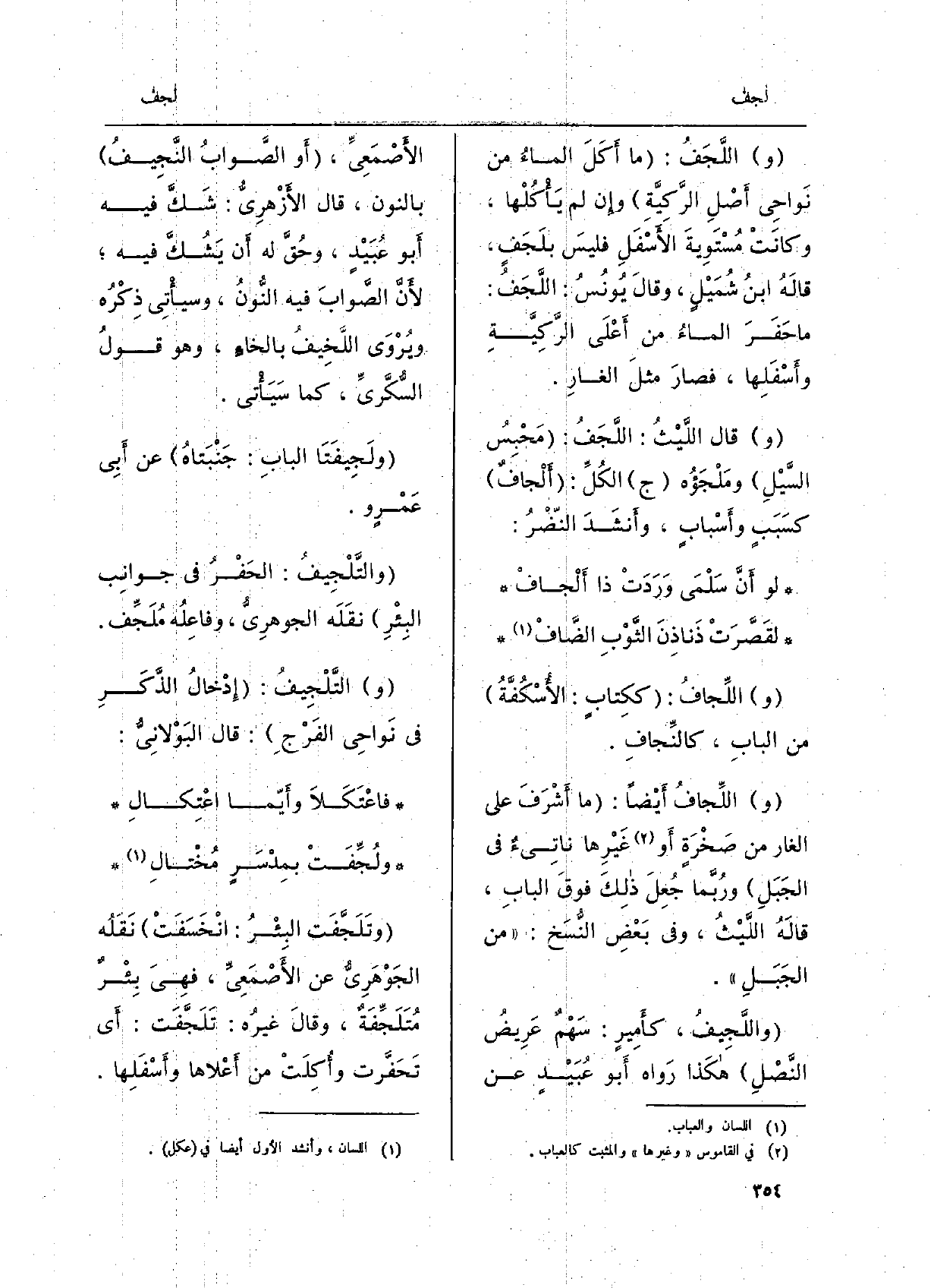 واللِّجافُ: ككِتابٍ: الأُسْكُفَّةُ من البابِ، كالنِّجافِ. واللِّجافُ أيْضاً: مَا أَشْرَفَ على الْغَار من صخْرَةٍ أَو غَيْرِها ناتئٌ فِي الجَبَلِ ورُبَّما جُعِلَ ذلِكَ فوقَ البابِ، قالَهُ اللَّيْثُ، وَفِي بَعْضِ النُّسَخ: من الجَبَلِ. واللَّجِيفُ، كأَمِيرٍ: سَهْمٌ عَرِيضُ النَّصْلِ هكَذا رَواه أَبو عُبَيْدٍ عَن الأَصْمَعِيِّ، أَو الصَّواب النَجِيف بالنُّون، قَالَ الأزْهرِيُّ: شكَّ فِيهِ أَبو عُبَيْدٍ، وحُقَّ لَهُ أَن يَشُكَّ فِيهِ لأَنَّ الصَّوابَ فِي النُّونُ، وسيأْتِي ذِكْرُه ويُرْوَى اللَّحِيفُ بالخاءِ، وَهُوَ قولُ السُّكَّريِّ، كَمَا سَيَأْتي. ولَجِفَتَا البابِ: جَنْبَتاهُ عَن أَبي عَمْرٍ و. والتَّلْجِيفُ: الحَفْرُ فِي جوانبِ البِئْرِ نقَلَه الجوهرِيُّ، وفاعِلُه مُلَجِّف.