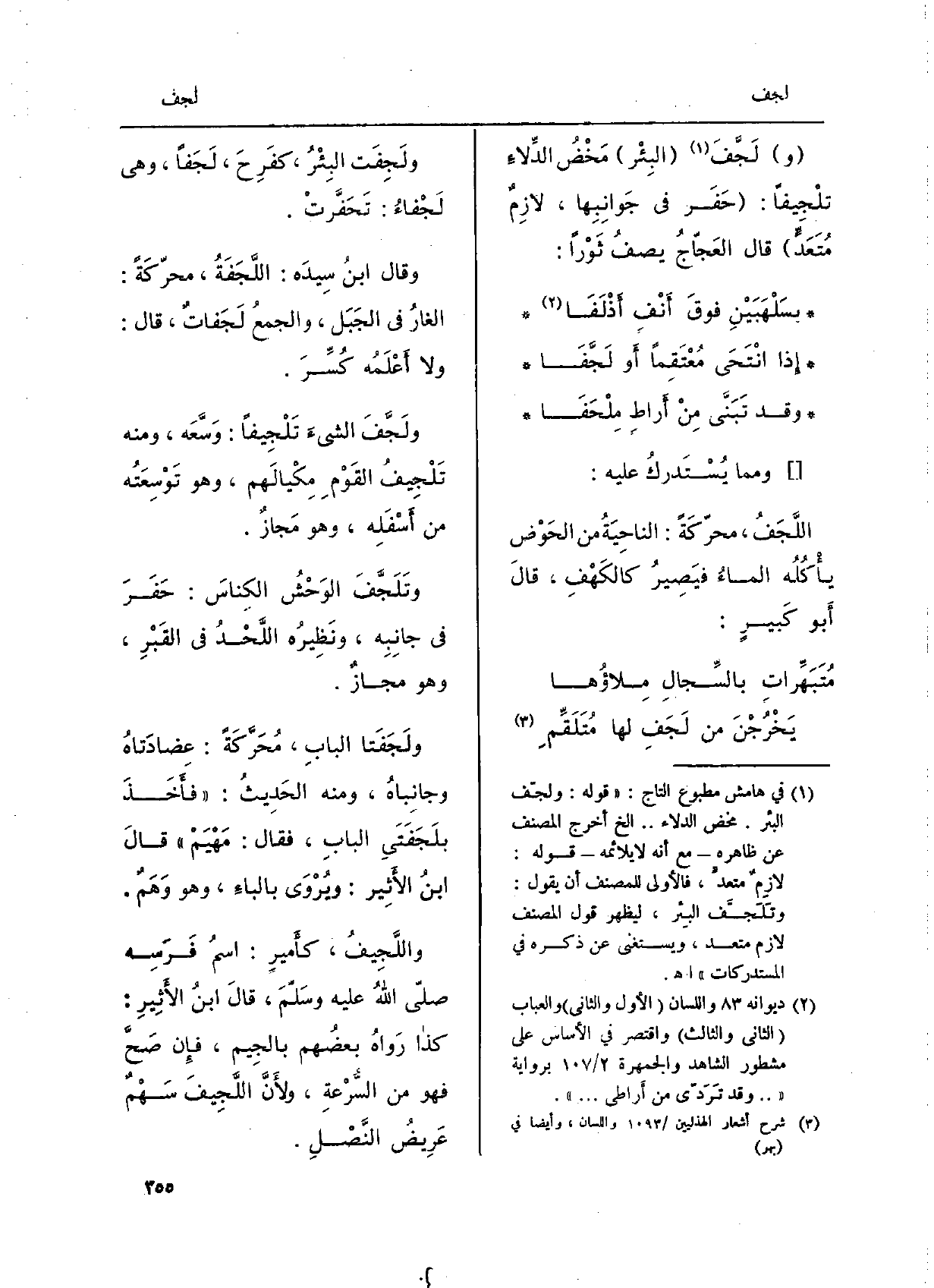 ولَجَّفَ البِئْر مَخْضُ الدِّلاءِ تلْجِيفاً: حفَر فِي جَوانِبِها، لازمٌ مُتَعدٍّ قَالَ العَجّاجُ يصفُ ثَوْراً: بسَلْهَبَيْنِ فوقَ أَنْفِ أَذْلَفا إِذا انْتَحَى مُعْتَقِماً أَو لَجَّفَا وَقد تَبَنَّى مِنْ أَراطِ مِلْحَفَا وَمِمَّا يُستدركُ عَلَيْهِ: اللَّجَفُ، محرّكَةً: الناحِيَةُ من الحَوْض يأْكُلُه الماءُ فيَصِيرُ كالكَهْفِ، قالَ أَبو كَبيرٍ: