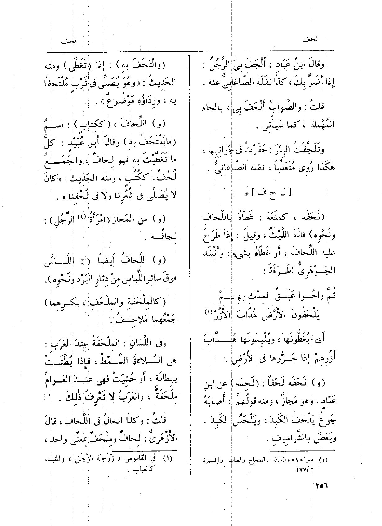 قلتُ: وَكَذَا الحالُ فِي اللِّحاف قَالَ الأزهريُّ: لِحافٌ ومِلْحَفٌ بِمَعْنى وَاحِد،
