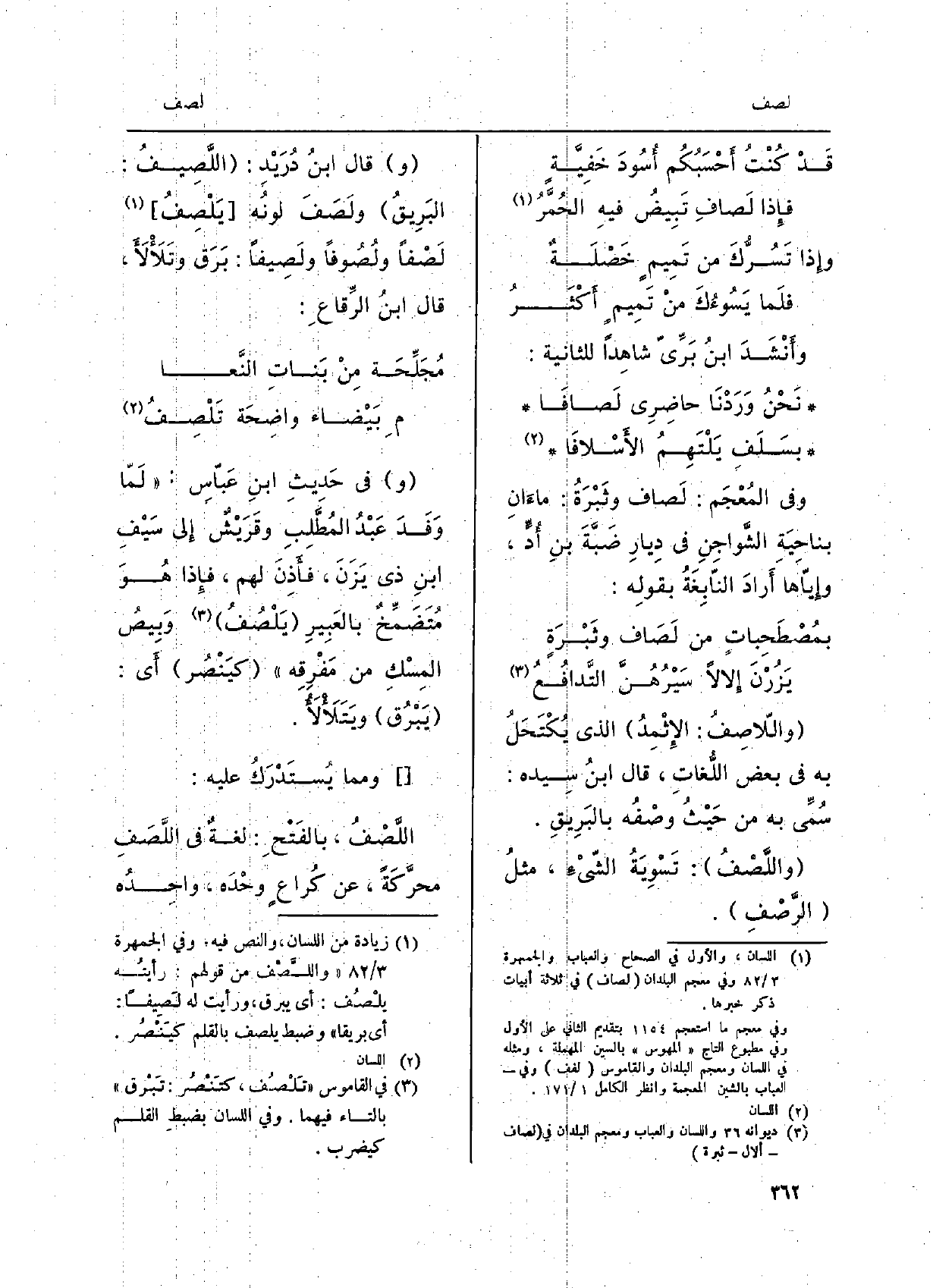 وأَنْشَدَ ابنُ بَرِّيّ شاهِداً للثَّانِيَة: نَحْنُ وَرَدْنا حاضِرِي لَصافَا بِسَلَفِ يَلْتَهِمُ الأَسْلافَا وَفِي المُعْجَم: لَصاف وثَبْرَةُ: ماءَانِ بناحِيَةِ الشَّواجِنِ فِي دِيارِ ضَبَّةَ بنِ أُدٍّ، وإِيّاها أَرادَ النابِغَةُ بقوله: