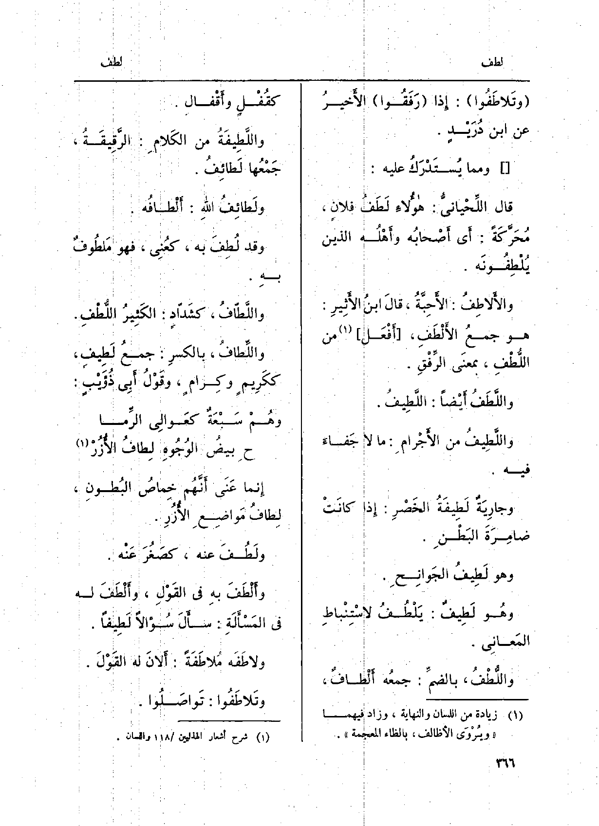 اللَّطِيفُ. واللَّطِيفُ من الأَجْرامِ: مَا لَا جَفاءَ فِيهِ. وجارِيَةٌ لَطِيفَةُ الخَصْرِ: إِذا كانَتْ ضامِرَةَ البَطْنِ. وَهُوَ لَطِيفُ الجَوانحِ. وَهُوَ لَطِيفٌ: يَلْطُفُ لاسْتِنْباطِ المَعانِي. واللُّطْفُ، بالضمِّ: جمعُه أَلْطافٌ، كقُفْلٍ وأَقْفال. واللَّطِيفَةُ من الكَلامِ: الرَّقِيقَةُ، جَمْعُها لَطائِفُ. ولَطائِفُ اللهِ: ألْطافُه. وَقد لُطِفَ بِهِ، كعُنِي، فَهُوَ مَلطُوفٌ بهِ. وَقد لُطِفَ بِهِ، كعُنِي، فَهُوَ مَلْطُوفٌ بهِ. واللَّطّافُ، كشَدّادٍ: الكَثِيرُ اللُّطْفِ. واللَّطاف، بِالْكَسْرِ كجمعُ لَطِيفِ، ككَرِيمٍ، وكِرامٍ، وقَوْلُ أَبِي ذُؤَيْبٍ: