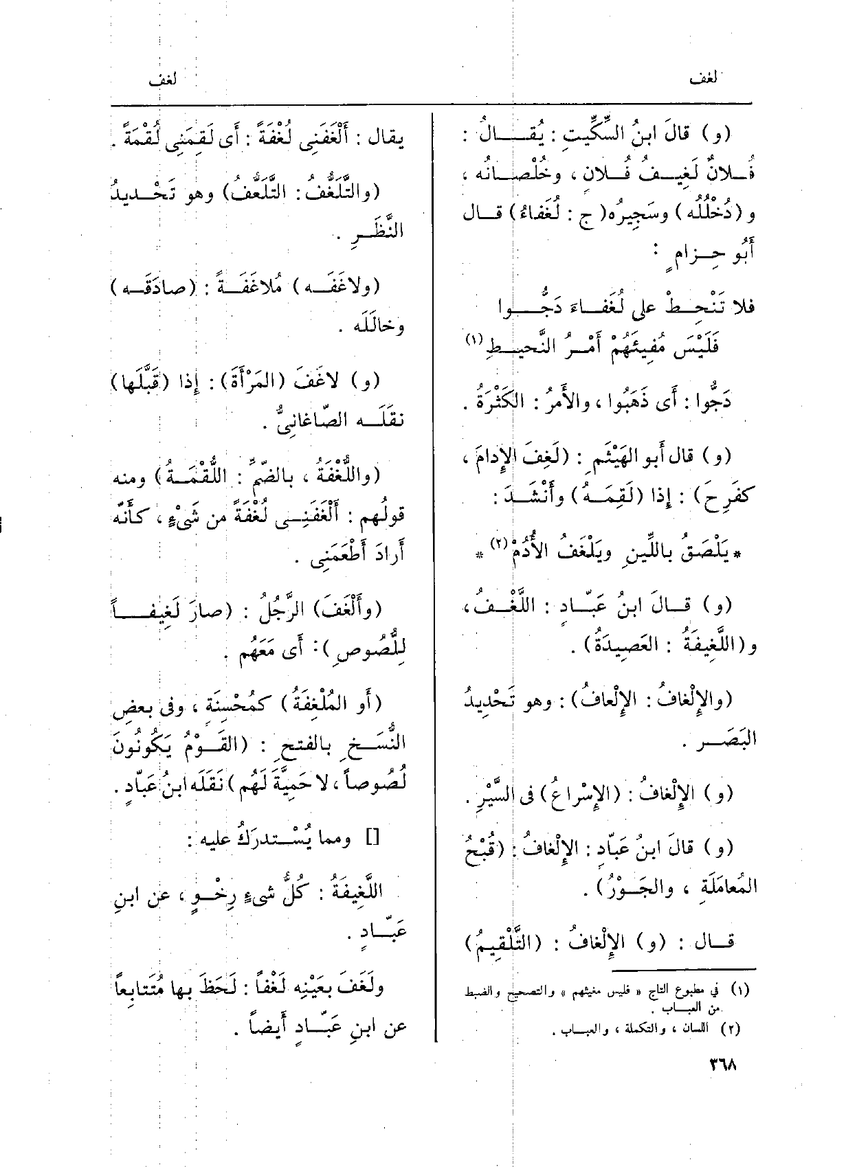 دَجُّوا: أَي ذَهَبُوا، والأَمرُ: الكَثْرَةُ. وَقَالَ أَبو الهَيْثَمِ: لَغِفَ الإِدامَ، كفَرِحَ: إِذا لَقِمَهُ وأَنْشَدَ: يَلْصَقُ باللِّينِ ويَلْغَفُ الأُدُمْ وقالَ ابنُ عَبّادٍ: اللَّغْفُ، واللَّغِيفَةُ: العَصِيدَةُ. والإِلْغافُ: الإِلْعافُ: وَهُوَ تَحْدِيدُ البَصَر. والإِلْغافُ: الإِسراعُ فِي السَّيْرِ. وَقَالَ ابنُ عَبّادٍ: الإِلْغافُ: قُبْحُ المُعامَلَةِ والجَوْرُ. قَالَ: والإِلْغافُ: التَّلْقِيمُ يُقَال: أَلْغَفَنِي لُغْفَةً: أَي لَقِمَنِي لُقْمَةَ. والتَّلَغُّفُ: التَّلَعُّفُ وَهُوَ تَحْديدُ النَّظَرِ. ولاغَفَه مُلاغَفَةً: صادَقَ وخالله. ولاغَفَ المَرْأَةَ: إِذا قَبَّلَها نَقَلَه الصاغانيُّ. واللُّغْفَةُ، بالضّمِّ: اللُّقْمَةُ وَمِنْه قولُهم: أَلْغَفَنِي لُغْفَةً من شَيءٍ، كأَنّه أَرادَ أَطْعَمَنِي. وأَلْغَفَ الرَّجُلُ: صارَ لَغِيفاً لِلُّصُوصِ: أَي مَعَهُم. أَو المُلْغِفَةُ كمُحْسِنَة، وَفِي بعض النُّسَخِ بالفَتحِ: القَوْمُ يَكُونونَ لُصُوصاً، لَا حَمِيَّةَ لَهُم نَقَلَه ابنُ عَبّادٍ.