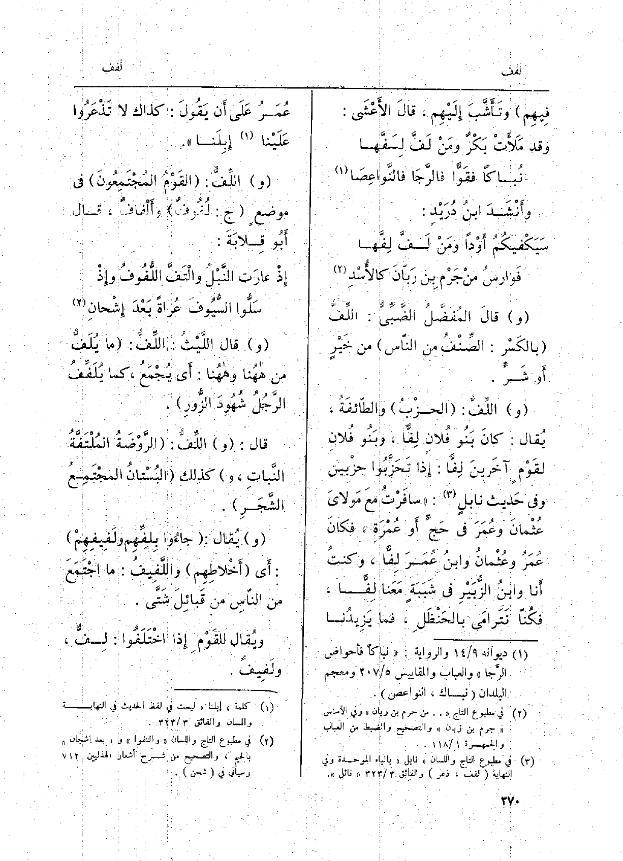 وقالَ المُفَضَّلُ الضَّبِّيُّ:} اللِّفُّ بالكَسْرِ: الصِّنْفُ من النّاس من خَيْرٍ أَو شَرٍّ. (و) {اللِّفُّ: الحزْبُ والطّائفَةُ، يُقال: كانَ بَنُو فُلانٍ لِفّاً، وبَنُو فُلانِ لقَوْمِ آخَرينَ لِفّاً: إِذا تَحَزَّبُوا حزْبين وَفِي حَدِيث نابلٍ: سافَرْتُ مَعَ مَولايَ عُثمانَ وعُمرَ فِي حَجٍّ أَو عُمرَةٍ، فكانَ عُمرُ وعُثْمانُ وابنُ عُمَرَ لِفّاً، وكنتُ أَنا وَابْن الزُّبَيْرِ فِي شَبَبَةٍ مَعَنا لِفّاً، فكُنّا نَتَرامَى بالحَنْظَلِ، فَمَا يَزِيدُنا عُمَرُ على أَن يَقُولَ: كَذَاك لَا تَذْعَرُوا عَلَيْنا إِبِلَنا. واللِّفُّ: القَوْمُ المُجْتَمِعُونَ فِي موضعٍ ج:} لُفُوفٌ {وألْفافٌ، قَالَ أَبو قِلابَةَ:
