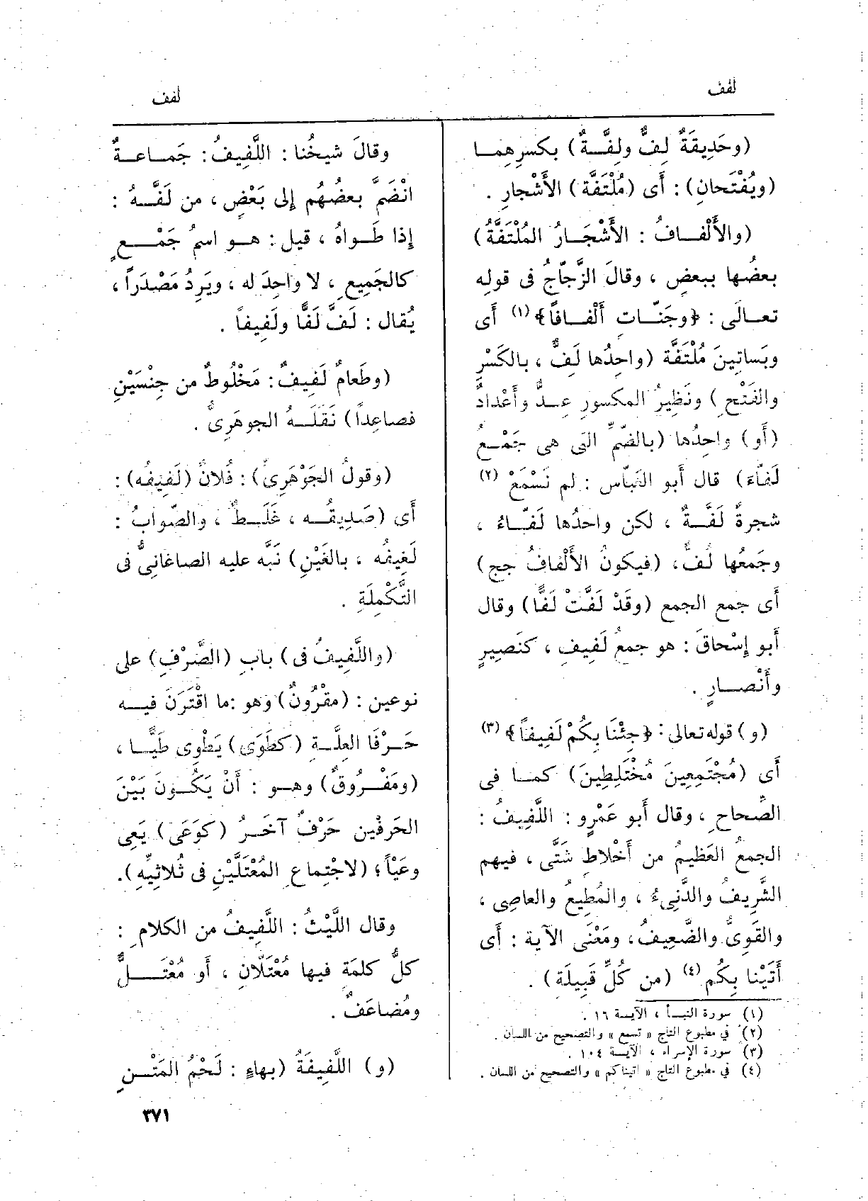 وحَدِيقَةٌ لِفٌّ {ولِفَّةٌ بكسرِهِما ويُفْتَحانِ: أَي} مُلْتَفَّة الأَشْجارِ، {والأَلْفافُ: الأَشْجارُ} المُلْتَفَّةُ بعضُها ببعضٍ، وَقَالَ الزَّجاجُ فِي قولهِ تَعَالَى: وجَنّاتٍ {أَلْفافاً أَي وبَساتِينَ} مُلْتَفَّة واحِدُها لِفٌّ، بالكَسْرِ والفتحِ ونَظِيرُ المكسورِ عدٌّ وأَعْدادٌ أَو واحِدُها بالضَّمِّ الَّتِي هِيَ جَمْعُ {لَفّاءُ قَالَ أَبو العَبّاس: لم نَسْمَعْ شجرةٌ} لَفَّةٌ، لَكِن واحدُها لَفّاءُ، وجَمْعُها {لُفُّ، فيكونُ} الألْفافُ جج أَي جمع الْجمع وقَدْ {لَفَّتْ لَفّاً وَقَالَ أَبو إِسْحاقَ: هُوَ جمعُ} لَفِيفٍ كنَصِيرٍ وأَنصارٍ. وَقَوله تَعَالَى: جِئْنَا بِكُمْ {لَفِيفاً أَي مُجْتَمِعِينَ مُخْتَلِطِينَ كَمَا فِي الصِّحاحِ، وَقَالَ أَبو عَمْرٍ و:} اللَّفِيفُ: الجمعُ العَظيمُ من أَخْلاطِ شَتَّى، فيهم الشريفُ والدَّنِيءُ، والمُطِيعُ والعاصِي، والقَوِيُّ والضَّعِيفُ، ومَعْنَى الْآيَة: أَي أَتَيْنا بِكُم من كُلِّ قَبِيلَةٍ. وَقَالَ شيخُنا: اللَّفِيفُ: جَماعةٌ انْضَمَّ بعضُهم إِلَى بعضٍ، من {لَفَّهُ: إِذا طَواهُ، قيل: هُوَ اسمُ جَمْعٍ كالجَمِيعِ، لَا واحِدَ لَهُ، ويَرِدُ مصْدَراً، يُقال: لَفَّ لَفّاً} ولَفِيفاً. وطَعامٌ {لَفِيفٌ: مَخْلُوطٌ من جِنْسَيْنِ فصاعِداً نَقله الجوهريُّ. وقولُ الجوهريِّ: فُلانٌ} لَفِيفُه: أَي صَدِيقه، غَلطٌ، والصَّوابُ: لَغِيفُه، بالغَيْنِ نَبَّه عَلَيْهِ الصاغانيُّ فِي التَّكْمِلَةِ. {واللَّفِيفُ فِي بابِ الصَّرْفِ على نوعِين: مقْرُونٌ وَهُوَ: مَا اقْتَرَنَ فِيهِ حَرْفَا العِلَّةِ كطَوَى يَطْوِي طَيَّاً، ومَفْرُوقٌ وَهُوَ: أَنْ يَكُونَ بَيْنَ الحَرفْين حَرْفٌ آخَرُ كوَعَى يَعِي وعَيْاً لاجْتِماعِ المُعْتَلَّيْنِ فِي ثُلاثِيِّةِ. وَقَالَ اللَّيْثُ: اللَّفِيفُ من الكلامِ: كلُّ كلمَةٍ فِيهَا مُعْتَلاّنِ، أَو مُعْتَلٌّ ومُضاعَفٌ. (و) } اللَّفِيفَةُ بهاءٍ: لَحْمُ المَتْنِ