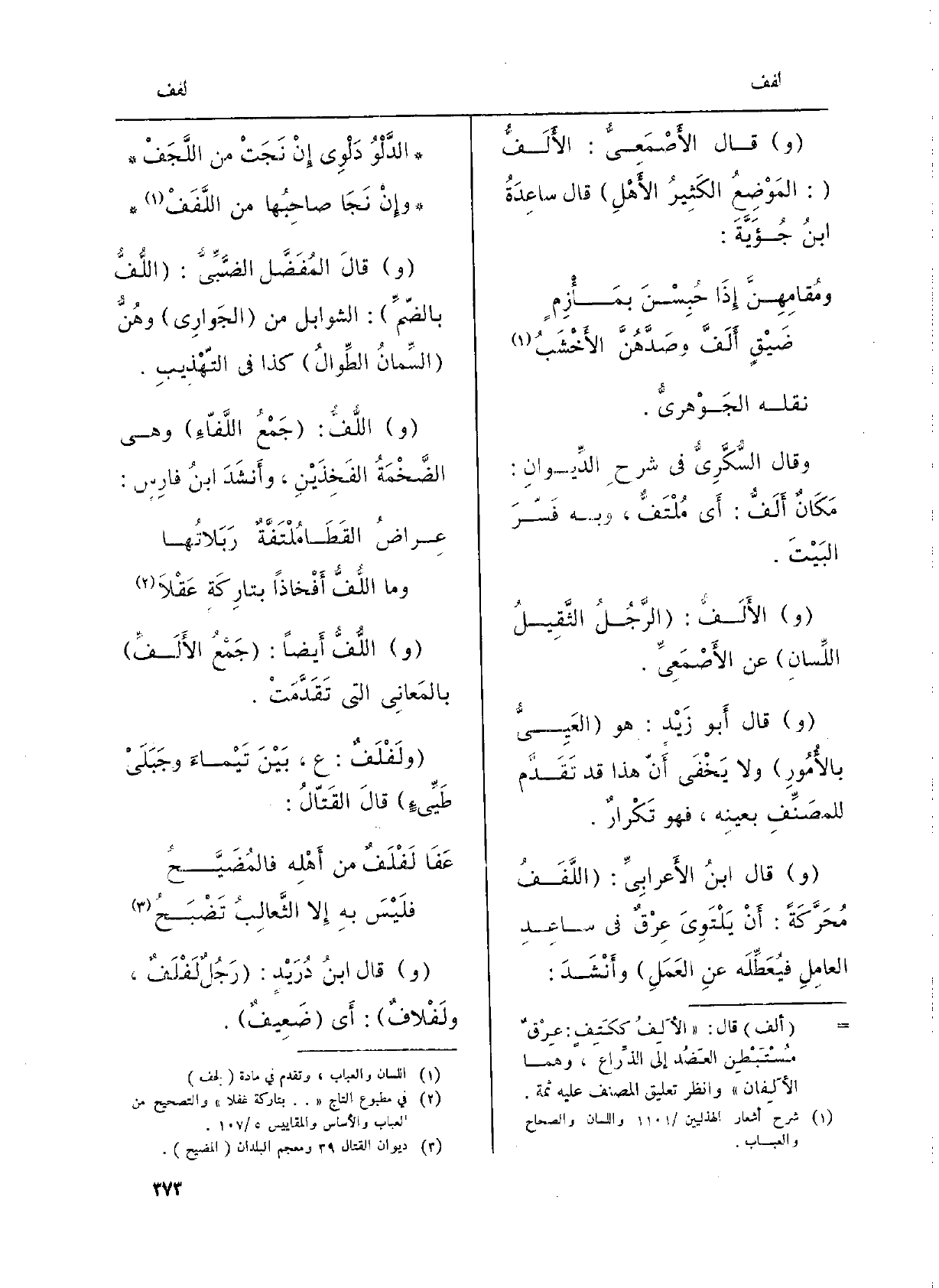 والأَلَفُّ: الرَّجُلُ الثَّقِيلُ اللِّسانِ عَن الأَصْمَعِيِّ. وَقَالَ أَبو زَيْدٍ: هُوَ العَيِيُّ بالأُمورِ وَلَا يَخْفَى أَنّ هَذَا قد تَقَدَّم للمصَنِّفِ بِعَيْنِه، فَهُوَ تَكْرارٌ. وَقَالَ ابْن الأعرابيِّ: {اللَّفَفُ مُحَرَّكَةً: أَنْ يَلْتَوِيَ عِرٍ قٌ فِي ساعِدِ العامِل فيُعَطِّلَه عنِ العَمَلِ. وأَنْشَدَ: الدَّلْوُ دَلْوِي إِنْ نَجَتْ من اللَّجَفْ وإِنْ نَجَا صاحِبُها من اللَّفَفْ وقالَ المُفَضَّل الضَّبِّيُّ:} اللُّفُّ بالضَّمِّ: الشوابل من الجَوارِي وهُنَّ السِّمانُ الطِّوالُ كَذَا فِي التّهْذِيبِ. واللُّفُّ: جَمْعُ {اللَّفاءِ وَهِي الضَّخْمَةُ الفَخِذَيْنِ، وأَنشَدَ ابنُ فارِسِ: