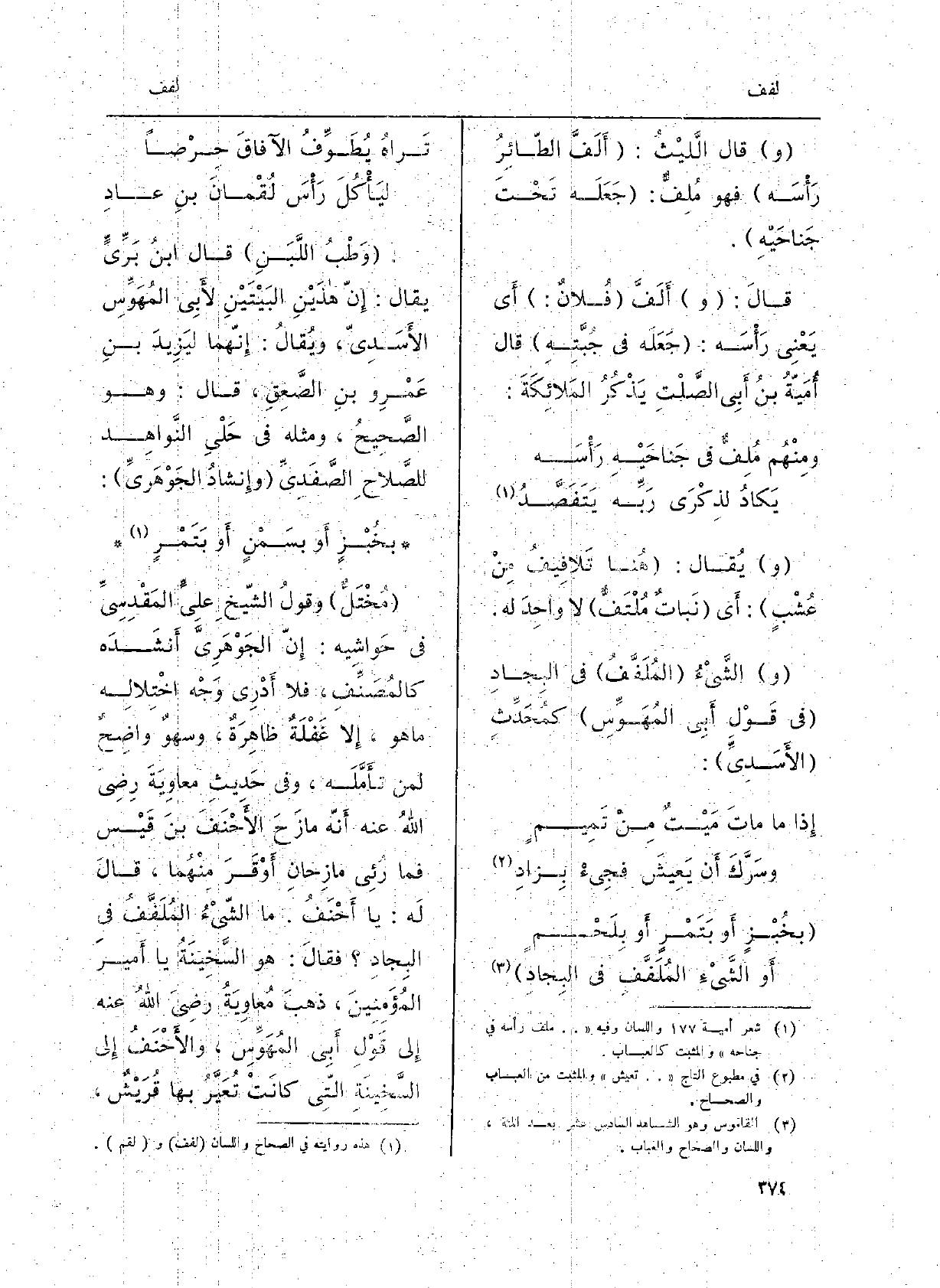 وَقَالَ اللَّيْثُ: {أَلَفَّ الطّائِرُ رَأْسِه فَهُوَ} مُلِفٌّ: جَعَله تحتَ جَناحَيْهِ. قَالَ: وأَلَفَّ فُلانٌ: أَي يَعْنِي رَأْسَه: جَعَله فِي جُبَّتِهِ قَالَ أُمَيَّةُ بنُ أَبِي الصَّلْتِ يَذْكُرُ المَلائِكَةَ: