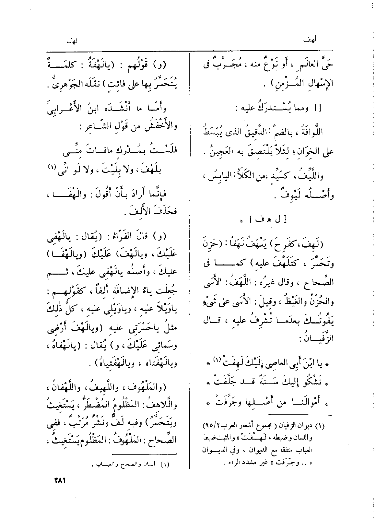 فإِنَّما أَرادَ بأَنْ أَقُولَ: والَهْفَا، فحذَفَ الأَلِفَ. وقالَ الفَرّاءُ: يُقال: يَا لَهْفِي عَلَيْكَ ويالَهْفَ عَلَيْكَ ويالَهْفَا عليكَ، وأَصلُه يَا لَهْفِي عليكَ، ثمَّ جُعِلَت ياءُ الإِضافَةِ أَلِفاً، كقَوْلِهم: يَا وَيْلاَ عليهِ، وياوَيْلِي عَلَيْهِ، كلُّ ذلِكَ مثلُ يَا حَسْرَتِي عليهِ وَيَا لَهْفَ أَرْضِي وسَمائِي عَلَيْكَ، ويُقال: يَا لَهْفاهُ، وَيَا لَهْفَتاه، ويالَهْفَتِياهُ. والمَلْهُوف، واللَّهِيفُ، واللَّهْفانُ، والَّلاهِفُ: المَظْلُومُ المُضْطَرُّ، يَسْتَغِيثُ ويَتَحَسَّرُ وفيهِ لَفٌّ ونَشْرٌ مُرَتَّبٌ، ففِي الصِّحاح: المَلُهُوفُ: المَظْلُوم يَسْتَغِيثُ،