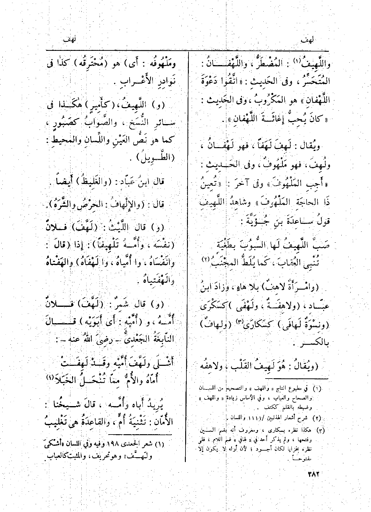 واللَّهِيفُ: المُضْطَرُّ، واللَّهْفانُ: المُتَحَسِّرُ، وَفِي الحَدِيثِ: اتَّقُوا دَعْوَةَ اللَّهْفانِ هُوَ المَكْرُوبُ، وَفِي الحَدِيث: كانَ يُحِبُّ إِغاثَةَ اللَّهْفانِ. ويُقال: لَهِفَ لَهَفاً، فَهُوَ لَهْفانُ، ولُهِفَ، فَهُوَ مَلْهُوفٌ، وَفِي الحَدِيث: أَجِبِ المَلْهُوفَ وَفِي آخرَ: تُعِينُ ذَا الحاجَةِ المَلْهُوفَ وشاهِدُ اللَّهِيفِ قولُ ساعِدَةَ بنِ جُؤَيَّةَ: