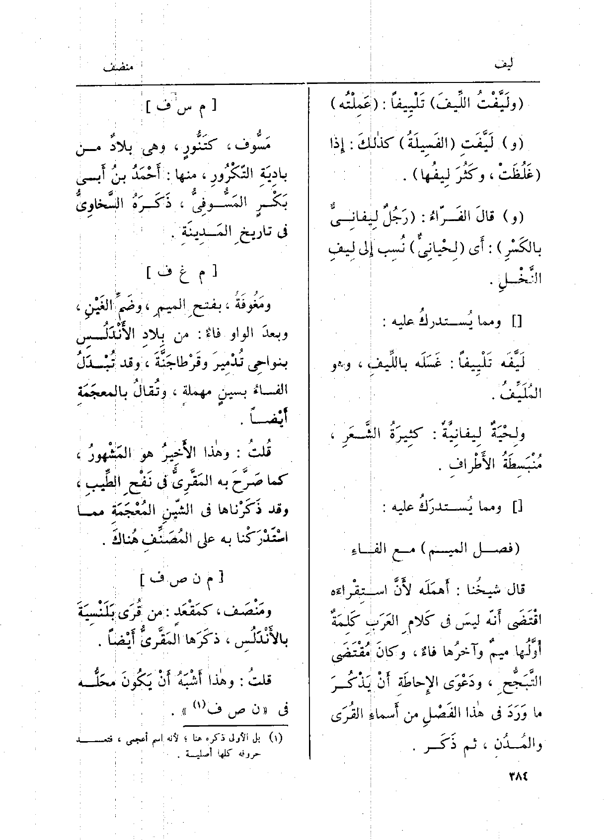 وَمِمَّا يُستدركُ عَلَيْهِ: فصل الْمِيم مَعَ الفاءِ قَالَ شيخُنا: أَهمَلَه لأَنَّ استِقْراءَه اقْتَضَى أَنَّه ليسَ فِي كَلامِ العَرَبِ كَلِمَةٌ أَوَّلُها ميمٌ وآخرُها فاءٌ، وكانَ مُقْتَضَى التَّبَجُّحِ، ودَعْوَى الإِحاطَةٍ أَنْ يَذْكُرَ مَا وَرَدَ فِي هَذَا الفَصْلِ من أَسماءِ القُرَى والمُدُنِ، ثمَّ ذَكَر.