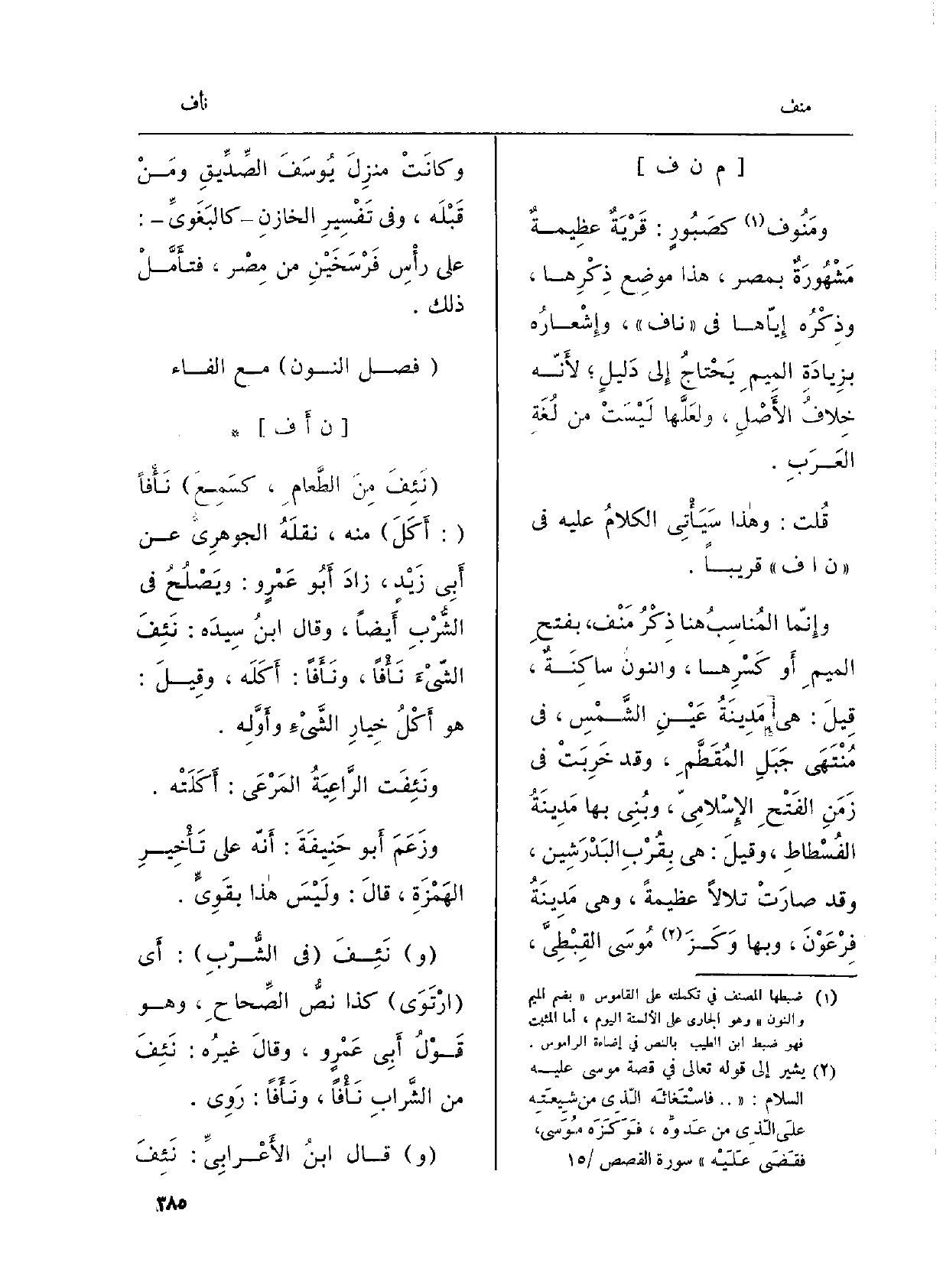 ومَنُوف كصَبُورٍ: قَرْيَةٌ عظِيمةٌ مَشْهُورَةٌ بِمصْر، هَذَا موضِع ذِكْرِها، وذِكْرُه إِيّاها فِي ناف، وإِشْعارُه بزِيادَةِ المِيمِ يَحْتاجُ إِلَى دَليلٍ، لأَنّه خِلافُ الأَصْلِ، ولعَلَّها لَيْسَتْ من لُغَةِ العَرَبِ. قلت: وَهَذَا سَيَأْتِي الكلامُ عَلَيْهِ فِي ن أُفٍّ قَرِيبا. وإِنّما المُناسِبُ هُنَا ذِكْرُ مَنْف، بفتحِ الميمِ أَو كَسْرِها، وَالنُّون ساكِنَةٌ، قِيلَ: هِيَ مَدِينَةُ عَيْنِ الشَّمْسِ، فِي مُنْتَهَى جَبَلِ المُقَطَّمِ، وَقد خَرِبَتْ فِي زَمَنِ الفَتْحِ الإِسلامِيّ، وبُنِي بهَا مَدِينةُ القُسْطاطِ، وقيلَ: هِيَ بِقُرْبِ البَدْرَشِين، وَقد صارَتْ تلالاً عَظِيمَة، وَهِي مَدينةُ فِرْعُونَ، وَبهَا وَكَزَ مُوسَى القِبْطِيِّ، وكانَتْ منزِلَ يُوسَفَ الصِّدِّيقِ ومَنْ قَبْلَه، وَفِي تَفْسِيرِ الخازِنِ كالبَغَويِّ: على رأْسِ فَرْسَخَيْنِ من مِصْر، فتَأَمَّلْ ذَلِك.