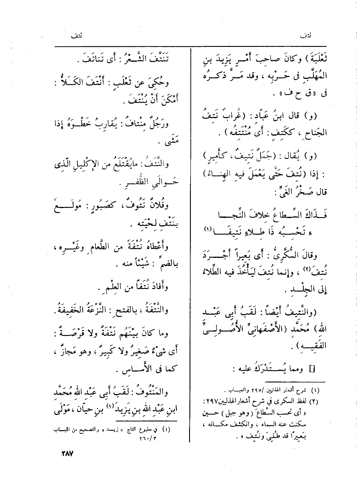 ثَعْلَبَةَ وكانَ صاحِبَ أَمْرٍ يَزِيدَ بنِ المُهَلَّبِ فِي حَرْبِه، وَقد مَرَّ ذكرُه فِي ق ح ف. وَقَالَ ابنُ عَبّادٍ: غُرابٌ نَتِفُ الجَناحِ، ككَتِفٍ: أَي مُنْتَتِفُه. ويُقال: جَمَلٌ نَتِيفٌ، كأَمِيرٍ: إِذا نُتِفَ حَتَّى يَعْمَلَ فيهِ الهِناءُ قَالَ صَخْرُ الغَيِّ:
