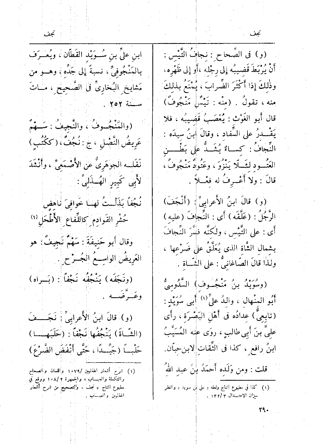 وَفِي الصِّحاحِ: نِجافُ التَّيْسِ: أَنْ يُرْبَطَ قَضِيبُه إِلَى رِجْلِه، أَو إِلَى ظَهْرِه، وذلِكَ إِذا أَكْثَر الضِّرابَ، يُمْنَعُ بذلِكَ مِنْهُ، تقَولُ. مِنْه: تَيْسٌ مَنْجُوفٌ قَالَ أَبو الغَوْثِ: يُعْصَبُ قَضِيبُه، فَلَا يَقْدِرُ على السِّفاد، وَقَالَ ابنُ سِيدَه: النِّجافُ: كِساءٌ يُشَدُّ على بَطْنِ العَتُودِ لئِلا يَنْزُوَ، وعَتُودٌ مَنْجُوفٌ، قالَ: وَلَا أَعْرِفُ لَهُ فِعْلاً. وقالَ ابنُ الأعرابِيِّ: أَنْجَفَ الرَّجُلُ: عَلَّقَه أَي: النِّجافَ عَلَيْهِ أَي: على التَّيْسِ، ولكنَّه فسَّرَ النِّجافَ بشِمالِ الشَّاةِ الَّذِي يُعلَّقُ على ضَرْعِها، وَلذَا قالَ الصاغانيُّ: على الشّاةِ. وسُوَيْدُ بنُ مَنْجُوفٍ السَّدُوسِيُّ أَبُو المِنْهالِ، والِدُ عليِّ أَبي سُوَيْدٍ: تابِعِيُّ عِدادُه فِي أَهْلِ البَصْرَةِ، رأَى علِيَّ بنَ أَبي طالبٍ، روَى عَنهُ المُسَيَّيْبُ ابنُ رافعٍ، كَذَا فِي الثِّقاتِ لِابْنِ حِبّان. قلت: وَمن وَلَدِه أحمدُ بنُ عبد اللهُ ابنِ عليِّ بن سُوَيْدٍ القطّان، ويُعرَف بالمَنْجُوفِيِّ، نِسْبَة إِلَى جَدِّهِ، وَهُوَ من مَشايخِ البُخاريِّ فِي الصَّحِيحِ، ماتَ سنة. والمَنْجُوفُ، والنَّجِيفُ: سَهْمٌ عَرِيضُ النَّصْلِ، ج: نُجُفٌ، ككُتُبٍ نَقَله الجوهَرِيُّ عَن الأَصْمَعِيِّ، وأَنْشَدَ لأَبي كَبِيرٍ الهُذَلِيِّ: