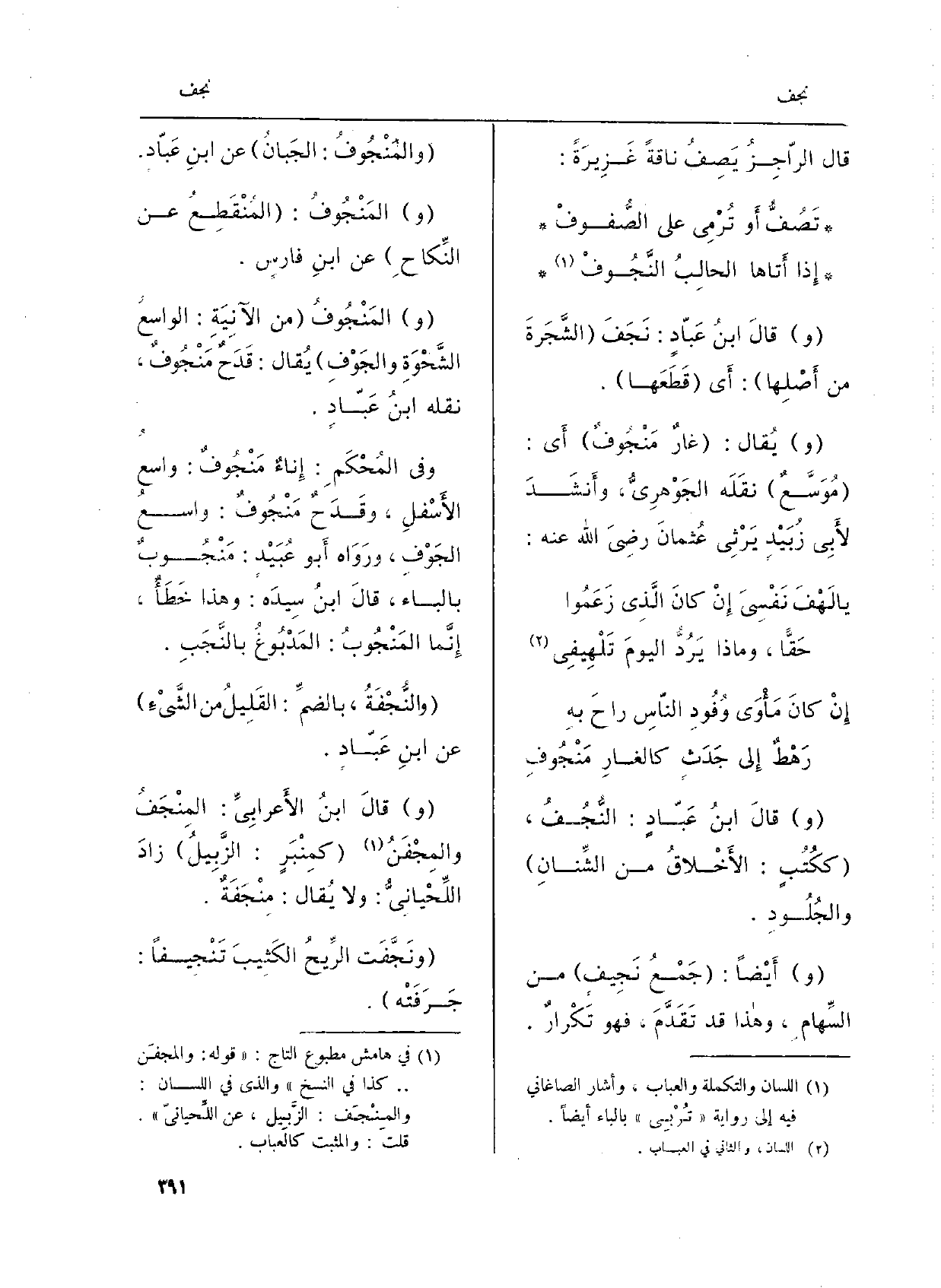 قَالَ الراجِزُ يَصِفُ نَاقَة غَزِيرَةً:) تَصُفُّ أَو تُرْمِي على الصُّفوفْ إِذا أَتاها الحالِبُ النُّجُوفْ وَقَالَ ابنُ عَبادٍ: نَجَفَ الشَّجَرَةَ من أَصْلِها: أَي قَطَعَها. ويُقال: غارٌ مَنْجُوفٌ أَي: مُوَسَّعٌ نقلهَ الجوهرِيُّ، وأنشَدَ لأَبِي زُبَيْدٍ يَرْثِي عُثمانَ رَضِي الله عَنهُ: