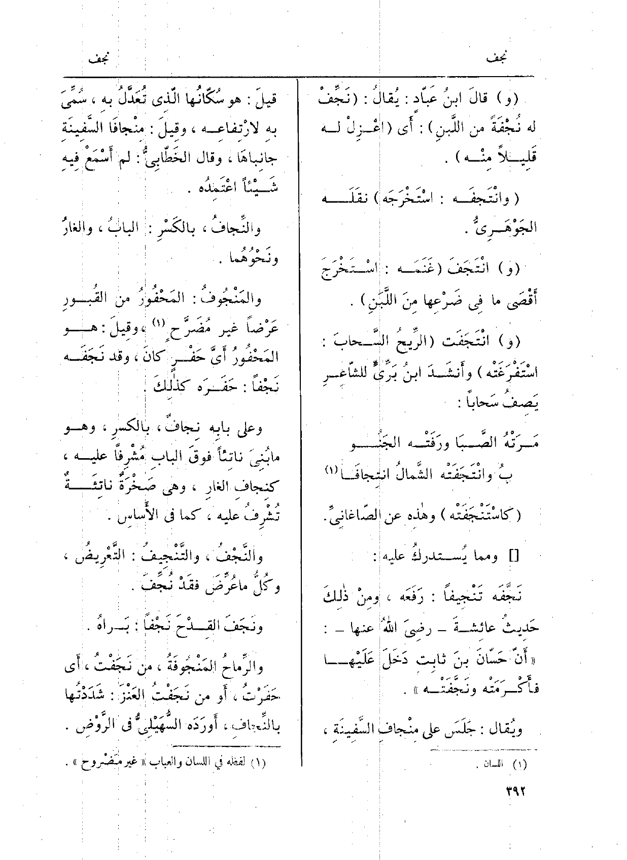 الأساسِ. والنَّجْفُ، والتَّنْجِيفُ: التَّعريضُ، وكُلُّ مَا عُرِّضَ فقدْ نُجِّفَ. ونَجَفَ القِدْحَ نَجْفاً: بَراهُ.