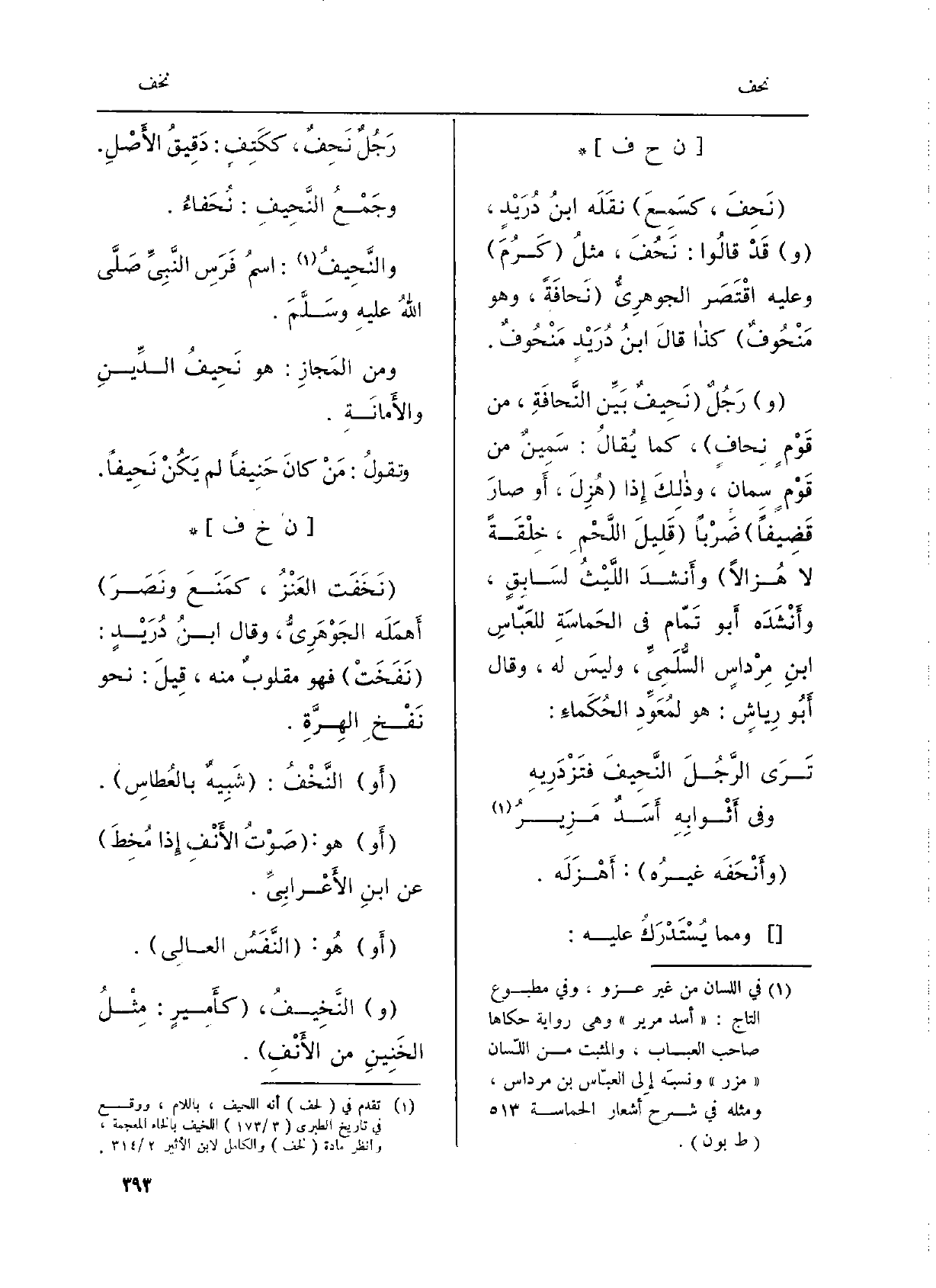 وَمِمَّا يُستدركُ عَلَيْهِ: رَجُلٌ نَحِيفٌ، ككَتِفٍ: دَقِيقُ الأَصْلِ. وجَمْعُ النَّحِيفِ: نُحَفاءُ. والنَّحِيفُ: اسمُ فَرَسِ النَّبِي صلى الله عَلَيْهِ وسلَّمَ. وَمن المَجازِ: هُوَ نَحِيفُ الدِّينِ والأَمانَةِ. وتقولُ: مَنْ كَانَ حَنِيفاً لم يَكُنْ نَحِيفاً.