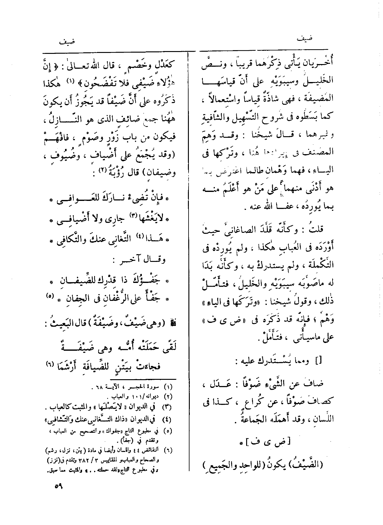 } الضَّيْفُ يكونُ للواحِدِ والجَمِيعِ كعَدْلٍ وخَصْمٍ، قَالَ الله تَعَالَى: إِنَّ هؤُلاءِ {ضَيْفِي فَلَا تَفْضَحُونِ هَكَذَا ذَكَرُوه على أَنَّ} ضَيْفاً قد يَجُوزُ أَن يكونَ ههُنا جمعَ {ضائِفٍ الَّذِي هُوَ النّازِلُ، فَيكون من بَاب زَوْرٍ وصَوْمٍ، فافْهَمْ وَقد يُجْمَعُ على} أَضْيافٍ، {وضُيُوفٍ،} وضِيفانٍ قَالَ رُؤْبَةُ: فإِنْ تُضِئْ نارَكَ للعَوافِي لَا يَغْشَها جارِي وَلَا {- أَضْيافِي هَذا التَّغانِي عنكَ والتَّكافِي وَقَالَ آخر: جَفْؤُكَ ذَا قِدْرِك} للضِّيفانِ جَفْأً على الرُّغْفانِ فِي الجِفانِ وَهِي {ضَيْفٌ،} وضِيْفَةٌ قَالَ البَعِيثُ:
