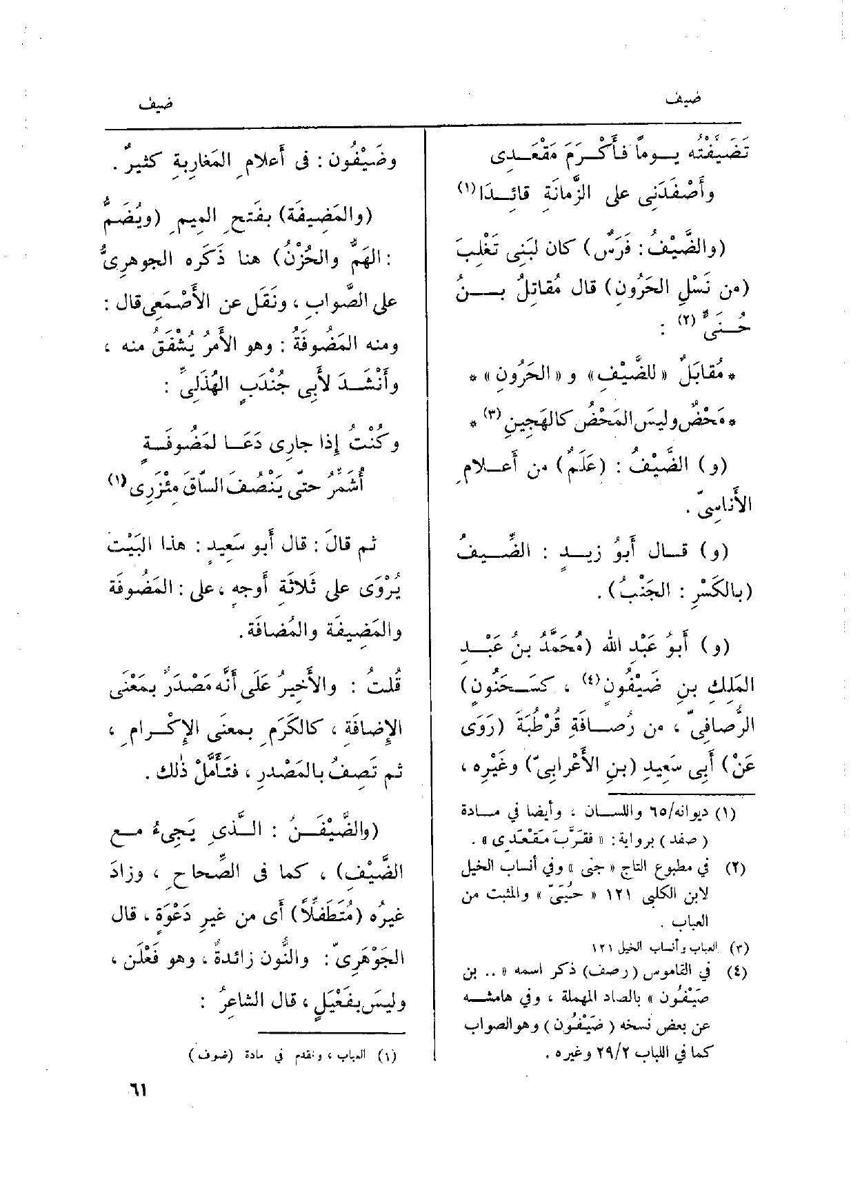 ثمَّ قالَ: قَالَ أَبو سَعِيدٍ: هَذَا البَيْتُ يُرْوَى على ثَلاثِةِ أَوجهٍ، على: المَضَوفَة والمَضِيفَة {والمُضافَة. قُلتُ: والأَخِيرُ عَلَى أَنَّه مَصْدَرٌ بمَعْنَى الإِضافَةِ، كالكَرَمِ بمعنَى الإِكْرامِ، ثمَّ تَصِفُ بالمَصْدرِ، فتَأَمَّلْ ذَلِك.} والضَّيْفَنُ: الَّذي يَجِيءُ مَعَ الضَّيْفِ، كَمَا فِي الصِّحاحِ، وزادَ غيرُه مُتَطَفِّلاً أَي من غيرِ دَعْوَةٍ، قَالَ الجَوْهَرِيُّ: والنُّون زائدةٌ، وَهُوَ فَعْلَن، وليسَ بفَعْيَلٍ، قَالَ الشاعِرُ: