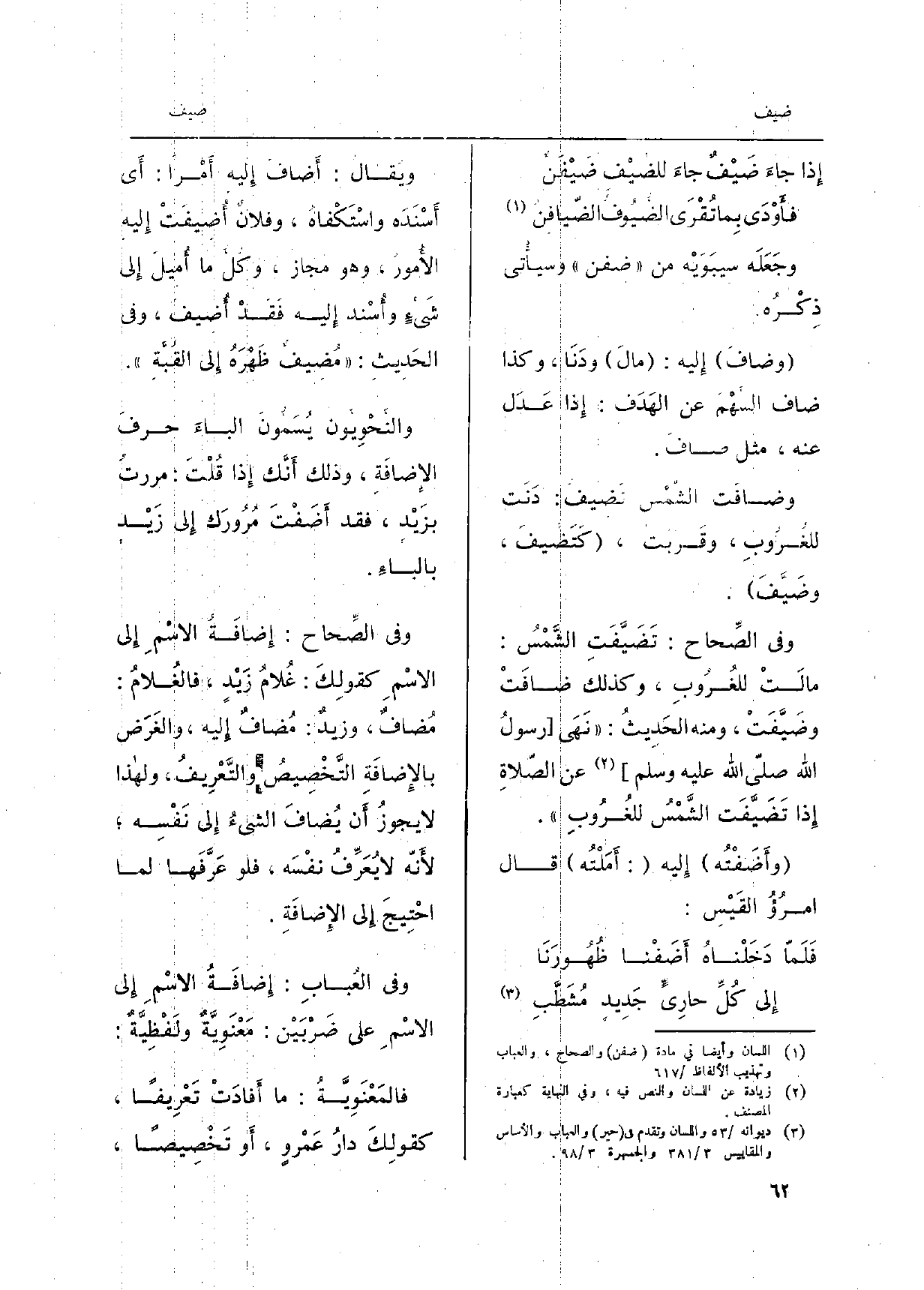 ويُقالُ: {أَضافَ إِليهِ أَمْراً: أَي أَسْنَدَهُ واسْتَكْفاهُ، وفلانٌ} أُضِيفَتْ إليهِ الأُمورُ، وَهُوَ مجَاز، وكُلُّ مَا أُمِيلَ إِلى شَيءٍ وأُسْنِد إِليهِ فَقَدْ {أُضِيفَ، وَفِي الحَدِيثِ:} مُضِيفٌ ظَهْرَهُ إِلَى القُبَّةِ. والنَّحْوِيُّون) يُسَمُّونَ الباءَ حرفَ {الإِضافَةِ، وَذَلِكَ أَنَّك إِذا قُلْتَ: مررتُ بزَيْدٍ، فقد} أَضَفْتَ مُرُورَك إِلى زَيْدٍ بالباءِ. وَفِي الصِّحاح: {إِضافَةُ الاسْمِ إِلَى الاسْمِ كقولِكَ: غُلامُ زَيْدٍ، فالغُلامُ:} مُضافٌ، زيدٌ: مُضافٌ إِليه، والغَرَض {بالإِضافَةِ التَّخْصِيصُ والتَّعْرِيفُ، وَلِهَذَا لَا يجوزُ أَنْ} يُضافَ الشيءُ إِلَى نَفْسِهِ لأَنَّه لَا يُعَرِّفُ نفْسَه، فَلَو عَرَّفَها لما احْتِيجَ إِلى الإِضافَةِ. وَفِي العُبابِ: إِضافَةُ الاسْمِ إِلى الاسْمِ على ضَرْبَيْن: مَعْنَوِيَّةٌ ولَفْظِيَّةٌ: فالمَعْنَوِيَّةُ: مَا أَفادَتْ تَعْرِيفاً، كقولِكَ دارُ عَمْروٍ، أَو تَخْصِيصاً،