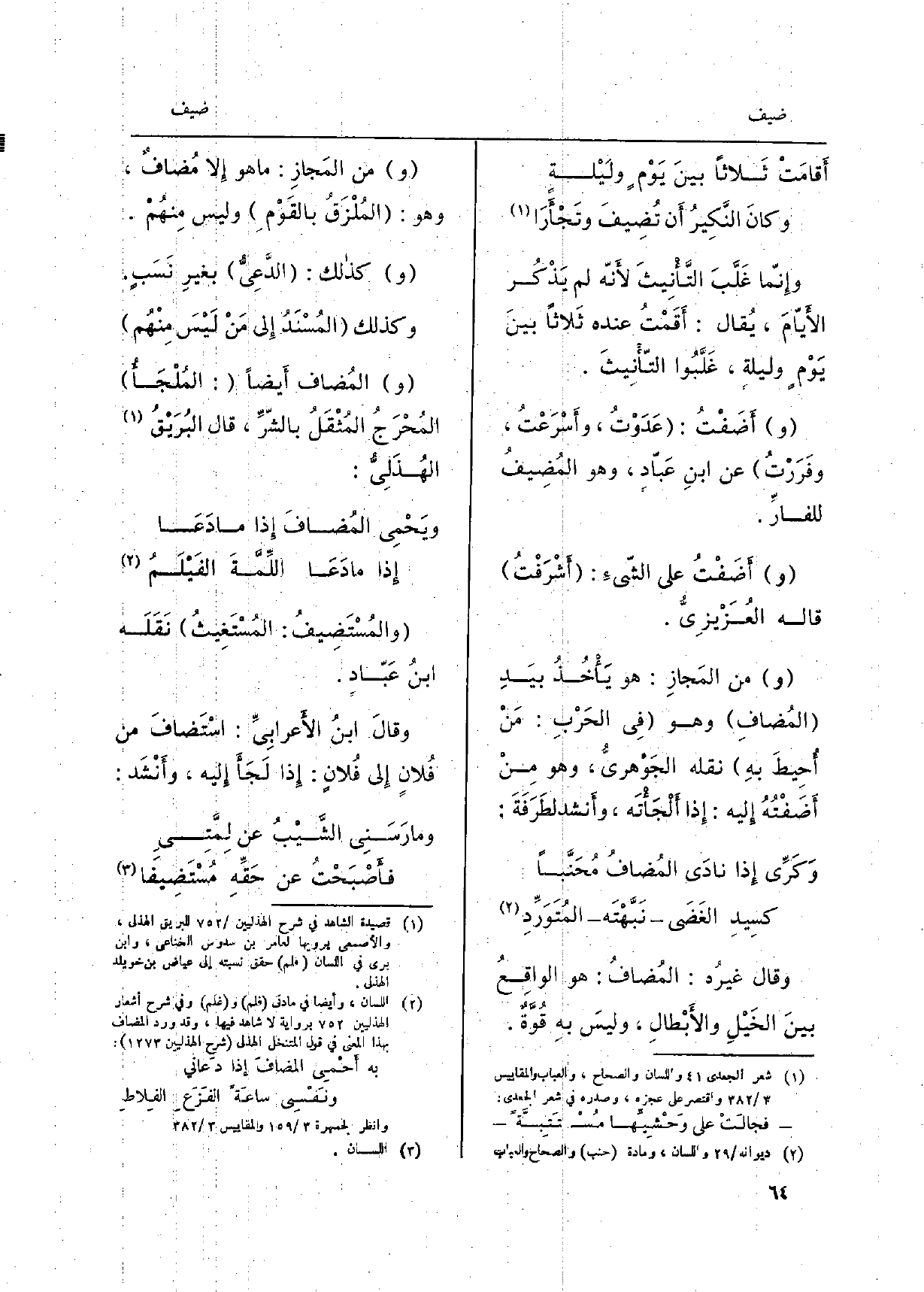 (و) } أَضَفْتُ: عَدَوْتُ، وأَسْرَعْتُ، وفَرَرْتُ عَن ابنِ عَبّادٍ، وَهُوَ {المُضِيفُ للفارِّ. وأَضَفْتُ على الشّيءِ: أَشْرَفْتُ قَالَه العُزيْزِيُّ. وَمن المَجازِ: هُوَ يَأْخُذُ بيَدِ المُضافِ وَهُوَ فِي الحَرْبِ: مَنْ أُحِيطَ بهِ نَقله الجَوْهَرِيُّ، وَهُوَ مِنْ} أَضَفْتُهُ إِليه: إِذا أَلْجَأْتَه، وأَنشد لطَرَفَةَ:) وَكَرِّي إِذا نادَى المُضافُ مُحَنَّباً كسِيدِ الغَضَى نَبَّهْتَه المُتَوَرِّدِ وَقَالَ غيرُه: المُضافُ: هُوَ الواقِعُ بينَ الخَيْلِ والأَبْطالِ، وليسَ بهِ قُوَّةٌ. وَمن المَجازِ: مَا هُوَ إِلا {مُضافٌ، وَهُوَ: المُلْزَقُ بالقَوْمِ وَلَيْسَ مِنْهُمْ. وَكَذَلِكَ: الدَّعِيُّ بغيرِ نَسَبٍ. وَكَذَلِكَ المُسْنَدُ إِلى مَنْ لَيْسَ مِنْهُم والمُضاف أَيضاً: المُلْجَأُ المُحْرَجُ المُثْقَلُ بالشّرِّ، قَالَ البُرَيْقُ الهُذَلِيُّ: