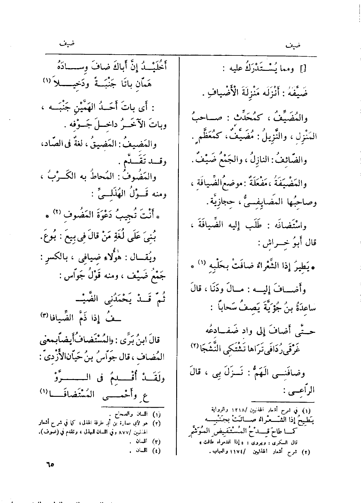 : أَي باتَ أَحَدُ الهَمَّيْنِ جَنْبَه، وباتَ الآخَرُ داخِلَ جَوْفِه.} والمَضِيفُ: المَضِيقُ، لغةٌ فِي الصّاد، وَقد تَقَدَّم. {والمَضُوفُ: المُحاطُ بِهِ الكَرْبُ، وَمِنْه قَوْلُ الهُذَلِيِّ: أَنْتَ تُجِيبُ دَعْوَةَ} المَضُوفِ بُنِيَ عَلَى لُغَةِ مَنْ قالَ فِي بِيعَ: بُوعَ. ويُقال: هؤُلاءِ {- ضِيافِي، بالكسرِ: جَمْعُ ضَيْف، وَمِنْه قَوْلُ جَوّاسِ: