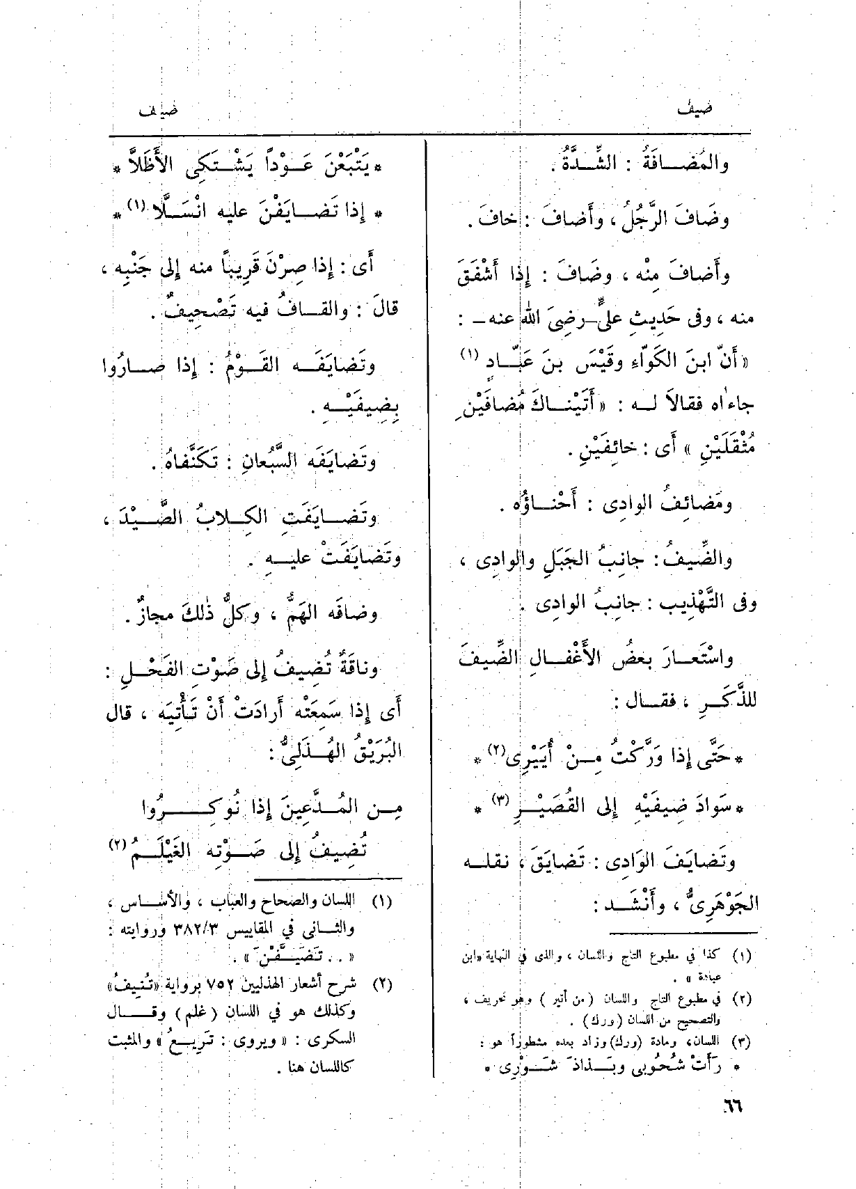 {والمُضافَةُ: الشِّدَّةُ.} وضَافَ الرَّجُلُ، {وأَضافَ: خافَ. وأَضافَ مِنْه، وضَافَ: إِذا أَشْفَقَ مِنْهُ، وَفِي) حَدِيثِ عليٍّ رضِيَ الله عَنهُ: أضنّ ابنَ الكَوّاءِ وقَيْسَ بنَ عَبّادٍ جاءاه فقالاَ لَهُ: أَتَيْناكَ} مُضافَيْنِ مُثْقَلَيْنِ أَي: خائِفَيْنِ. {ومَضائِفُ الوادِي: أَحْناؤُه.} والضِّيفُ: جانِبُ الْجَبَل والوادي وَفِي التَّهْذِيب جَانب الْوَادي. واسْتَعارَ بعضُ الأَغْفالِ {الضِّيفَ للذَّكَرِ، فَقَالَ: حَتَّى إِذا وَرَّكْتُ مِنْ أُيَيْرِي سَوادَ} ضِيفَيْهِ إِلى القُصَيْرِ {وتَضايَفَ الوَادِي: تَضايَقَ، نَقله الجَوْهَرِيُّ، وأَنْشَدَ: يَتْبَعْنَ عَوْداً يَشْتكِي الأَظَلاَّ إِذا} تَضايَفْنَ عَلَيْهِ انْسَلاَّ أَي: إِذا صِرْنَ قَرِيباً مِنْهُ إِلى جَنْبِه، قالَ: والقافُ فَهِيَ تَصْحِيفٌ. {وتَضايَفَه القَوْمُ: إِذا صارُوا بِضِيفَيْهِ. وتَضايَفَه السَّبُعانِ: تَكَنَّفاهُ.} وتَضايَفَتِ الكِلابُ الصَّيْدَ، وتَضايَفَتْ عليهِ. {وضافَه الهَمُّ، وكلُّ ذلكَ مجازٌ. وناقَةٌ} تُضِيفُ إِلى صَوْتِ الفَحْلِ: أَي إِذا سَمِعَتْه أَرادَتْ أَنْ تَأْتِيَه، قَالَ البُرَيْقُ الهُذَلِيُّ: