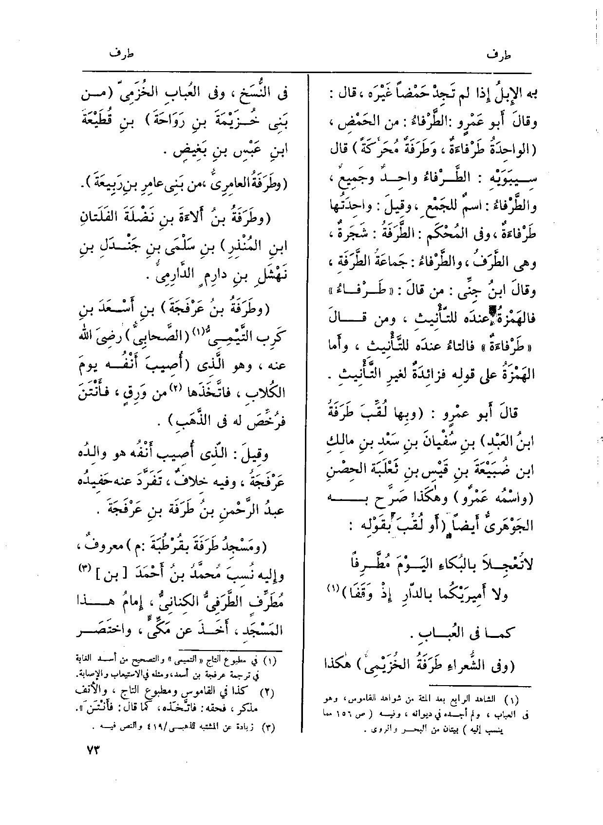 وطَرَفَةُ بنُ عَرْفَجَةَ بنِ أَسْعَدَ بنِ كَرِب التَّيْمِيُّ الصَّحابِيُّ رضِيَ الله عَنهُ، وَهُوَ الَّذي أُصِيبَ أَنْفُهُ يومَ الكُلابِ، فاتَّخَذَها من وَرِقٍ، فأَنْتَنَ فرُخِّصَ لَهُ فِي الذَّهَبِ. وقِيلَ: الّذي أُصِيب أَنْفُه هُوَ والِدُه عَرْفَجَةُ، وَفِيه خِلافٌ، تَفَرَّدَ عَنهُ حَفِيدُه عبدُ الرَّحْمنِ بنُ طَرَفَة بنِ عَرْفَجَةَ. ومَسْجِدُ طَرَفَةَ بقُرْطُبَةَ: م معروفٌ، وإِليه نُسِبَ مُحمَّدُ بنُ أَحْمَدَ بن مُطَرِّفٍ الطَّرَفِيُّ الكِنانِيُّ، إِمامُ هَذَا المَسْجِدِ، أَخَذَ عَن مَكِّيٍّ، واختَصَر
