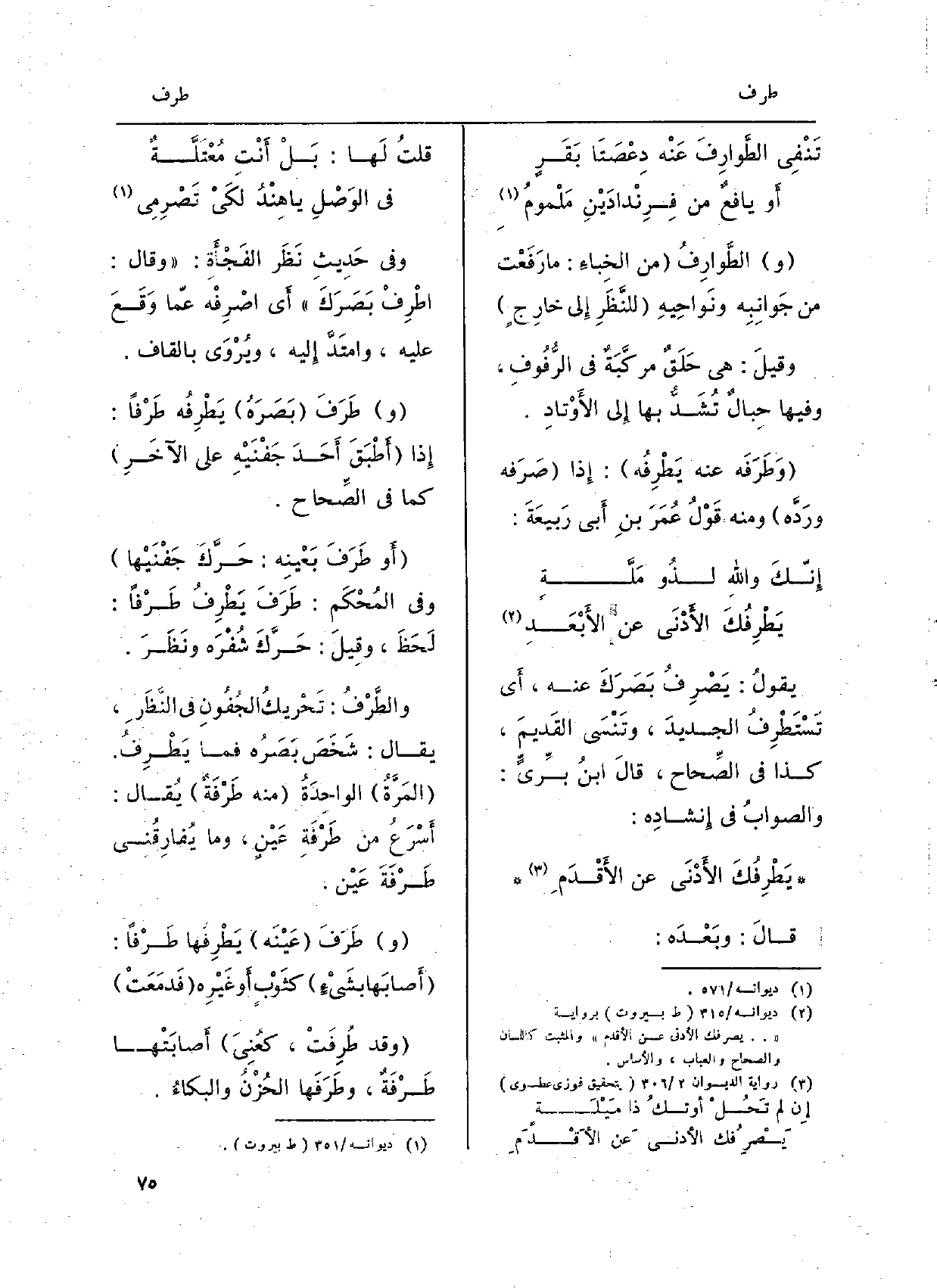 وَفِي حَديثِ نَظَر الفَجْأَةِ: وَقَالَ: اطرِفْ بَصَرَكَ أَي اصْرِفْه عَمّا وَقَعَ عَلَيْهِ، وامتَدَّ إِليه، ويُرْوَى بِالْقَافِ. وطَرَفَ بَصَرَهُ يَطْرِفُه طَرْفاً: إِذا أَطْبَقَ أَحَدَ جَفْنَيْهِ على الآخَرِ كَمَا فِي الصِّحاح. أَو طَرَفَ بعَيْنِه: حَرَّكَ جَفْنَيْها وَفِي المُحْكمِ: طَرَفَ يَطْرِفُ طَرْفاً: لَحَظَ، وقِيلَ: حَرَّكَ شُفْرَه ونَظَرَ.