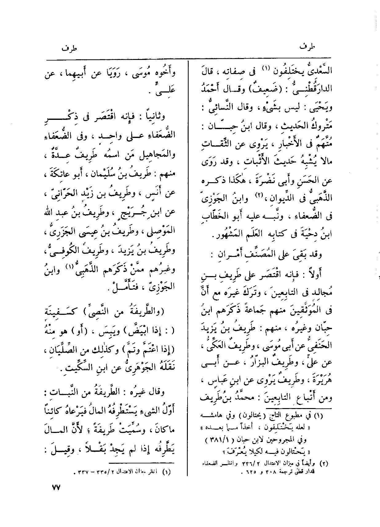 السَّعْدِيُّ يختَلِفُون فِي صِفاتِه، قالَ الدارَقُطْنِيُّ: ضَعِيفٌ وَقَالَ أَحْمَدُ ويَحْيَى: لَيْسَ بشَيْءٍ، وَقَالَ النَّسائِيُّ: مَتْروكُ الحَديثِ، وَقَالَ ابنُ حِبّان: مُتَّهَمٌ فِي الأَخْبارِ، يَرْوِي عَن الثِّقاتِ مَا لَا يُشْبِهُ حَديثَ الأَثْباتِ، وَقد رَوَى عَن الحَسَنِ وأَبي نَضْرَةَ، هكَذا ذكره الذَّهَبِيُّ فِي الدِّيوانِ، وابنُ الجَوْزِيّ فِي الضُّعَفاءِ، ونبَّه عَلَيْهِ أَبو الخَطّابِ بنُ دِحْيَةَ فِي كتابِه العَلَم المَشْهُور. وَقد بَقِيَ على المُصَنَّفِ أَمْرانِ: أوّلاً: فإِنه اقْتَصَر على طَرِيفِ بنِ مُجالِدٍ فِي التابِعِينَ، وتَرَكَ غيرَه مَعَ أَنَّ فِي المُوَثَّقِينَ مِنْهُم جَماعة ذَكَرَهم ابنُ حِبّان وغيرُه، مِنْهُم: طَرِيفُ بنُ يَزيدَ الحَنَفِيُّ عَن أَبي مُوسَى، وطَرِيفٌ العَكِّيُّ، عَن عليٍّ، وطَرِيفٌ البزّارُ، عَن أَبي هُرَيْرَةَ، وطَرِيفٌ يَرْوِي عَن ابنِ عَباتٍ، وَمن أَتْباع التابِعِينَ: محمَّدُ بنُ طَرِيف وأَخُوه مُوسَى، رَوَيَا عَن أَبيهِما، عَن عَلِيٍّ. وثانِياً: فإِنه اقْتَصَر فِي ذِكْرِ الضُّعَفَاءِ على واحِدٍ، وَفِي الضُّعَفاءِ والمَجاهِيلِ مَن اسمُه طَرِيفٌ عِدَّةٌ، مِنْهُم: طَريفُ بنُ سُلَيْمانَ، أَبو عاتِكَةَ، عَن أَنَسٍ، وطَريفُ بن زَيْدٍ الحَرّانِيّ، عَن ابنِ جُرَيْحٍ، وطَرِيْفُ بنُ عبدِ الله المَوصِلي، وطَريفُ بنُ عِيسَى الجَزَرِي، وطَرِيفُ بنُ يَزيدَ، وطَرِيفٌ الكُوفِيُّ، وغيرُهم ممَّنْ ذَكَرَهم الذَّهَبِي وابنُ الجَوْزِيّ، فَتَأَمَّلْ. والطَّرِيفَةُ من النَّصِيِّ كسَفِينَةٍ: إِذا ابْيَضَّ ويَبِسَ، أَو هُوَ مِنْهُ إِذا اعْتَمَّ وتَمَّ وكذلِك من الصِّلِّيَانِ، نَقَلَهُ الجَوْهَرِيُّ عَن ابْنِ السِّكِّيتِ. وَقَالَ غيرُه: الطَّريفَةُ)