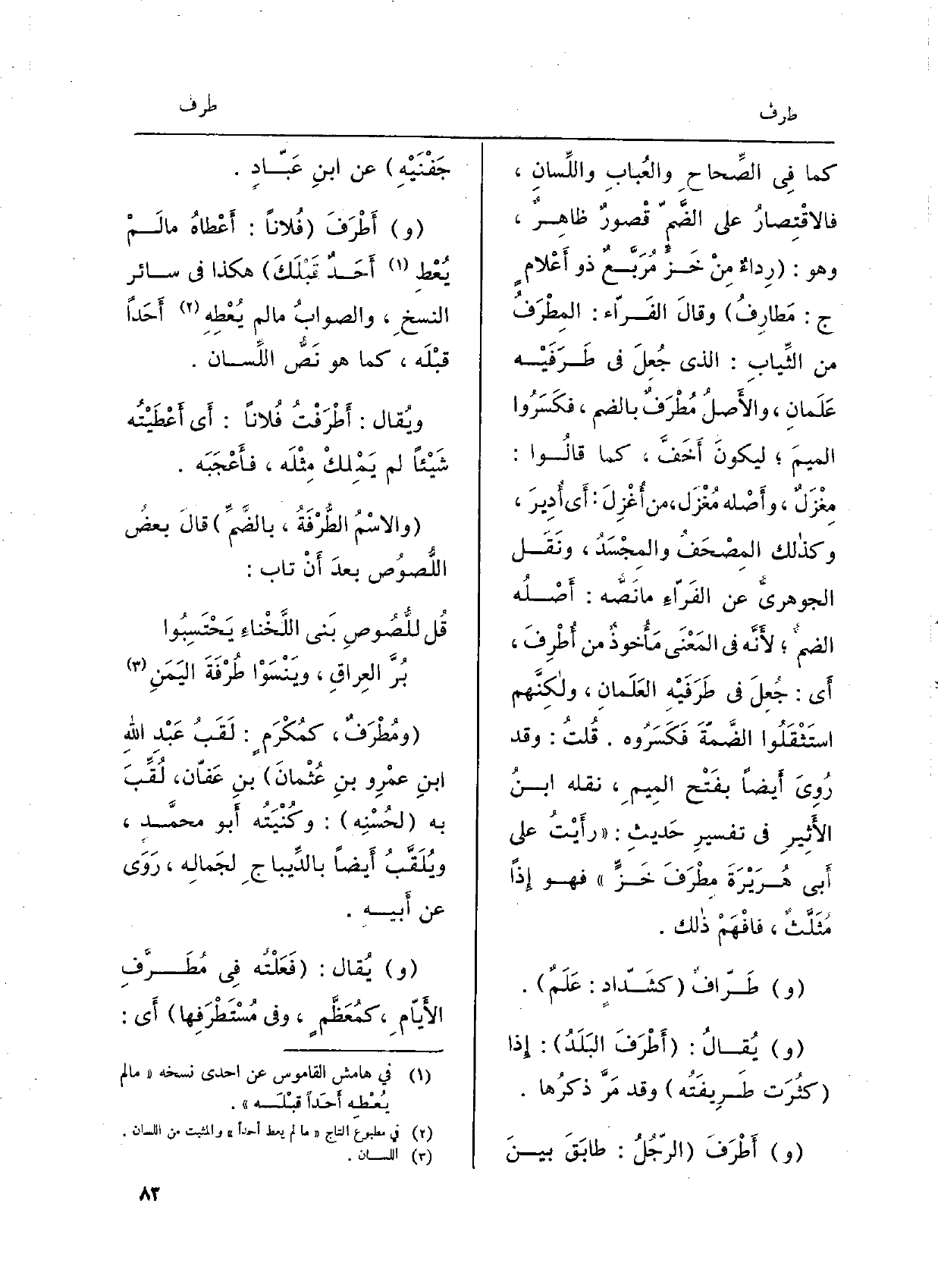 وطَرّافٌ كشَدّادٍ: عَلَمٌ. ويُقالُ: أَطْرَفَ البَلَدُ: إِذا كثُرَت طَرِيفَتُه وَقد مَرَّ ذكرُها. وأَطْرَفَ الرَّجُلُ: طابَقَ بينَ جَفْنَيْهِ عَن ابنِ عَبّادٍ. وأَطْرَفَ فُلاناً: أَعْطاهُ مَا لَمْ يُعْطِ أَحَدٌ قَبْلَكَ هَكَذَا فِي سَائِر النسخِ، والصوابُ مَا لم يُعْطِهِ أَحَداً قبْلَه، كَمَا هُوَ نَصُّ اللِّسان. ويُقال: أَطْرَفْتُ فُلاناً: أَي أَعْطَيْتُه شَيْئاً لم يَمْلِكْ مِثْلَه، فأَعْجَبَه. والاسْمُ الطُّرْفَةُ، بالضَّمِّ قالَ بعضُ اللُّصُوص بعدَ أَن تَابَ: