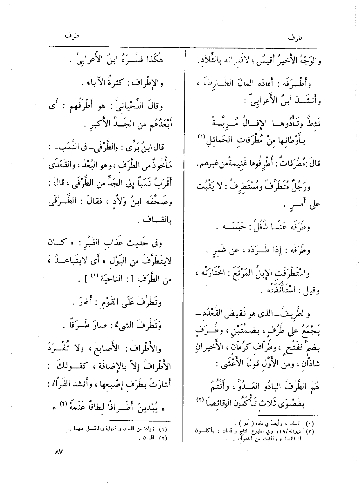 هَكَذَا فسَّرَهُ ابنُ الأَعرابِيُّ. والإِطْراف: كثرةُ الآباءِ. وقالَ اللِّحْيانِيُّ: هُوَ أَطْرَفُهم: أَي أَبْعَدُهُم من الجَدِّ الأَكْبَرِ. قَالَ ابنُ بَرِّي: والطُّرْفَى فِي النَّسَب: مَأْخُوذٌ من الطَّرَفِ، وَهُوَ البُعْدُ، والقُعْدَى أَقْرَبُ نَسَباً إِلى الجَدِّ من الطُّرْفَى، قالَ: وصَحَّفَه بانُ وَلاّدٍ، فقالَ: الطَّرْقَى بِالْقَافِ. وَفِي حَديث عَذابِ القَبْرِ: كَانَ لَا يتَطَرَّفُ من البَوْلِ أَي لَا يتَباعدُ، من الطَّرَف: الناحيَة. وتَطَرَّفَ عَلَى القَوْمِ: أَغارَ. وَتَطَّرفَ الشيءُ: صارَ طَرَفاً. والأَطْرافُ: الأَصابعُ، وَلَا تُفْرَدُ الأَطْرافُ إِلاّ بالإِضافَة، كقولِك: أَشارَتْ بطَرَفِ إِصْبعِها، وأَنشد الفَرّاءُ: يُبْدينَ أَطْرافاً لِطافاً عَنَمَهْ