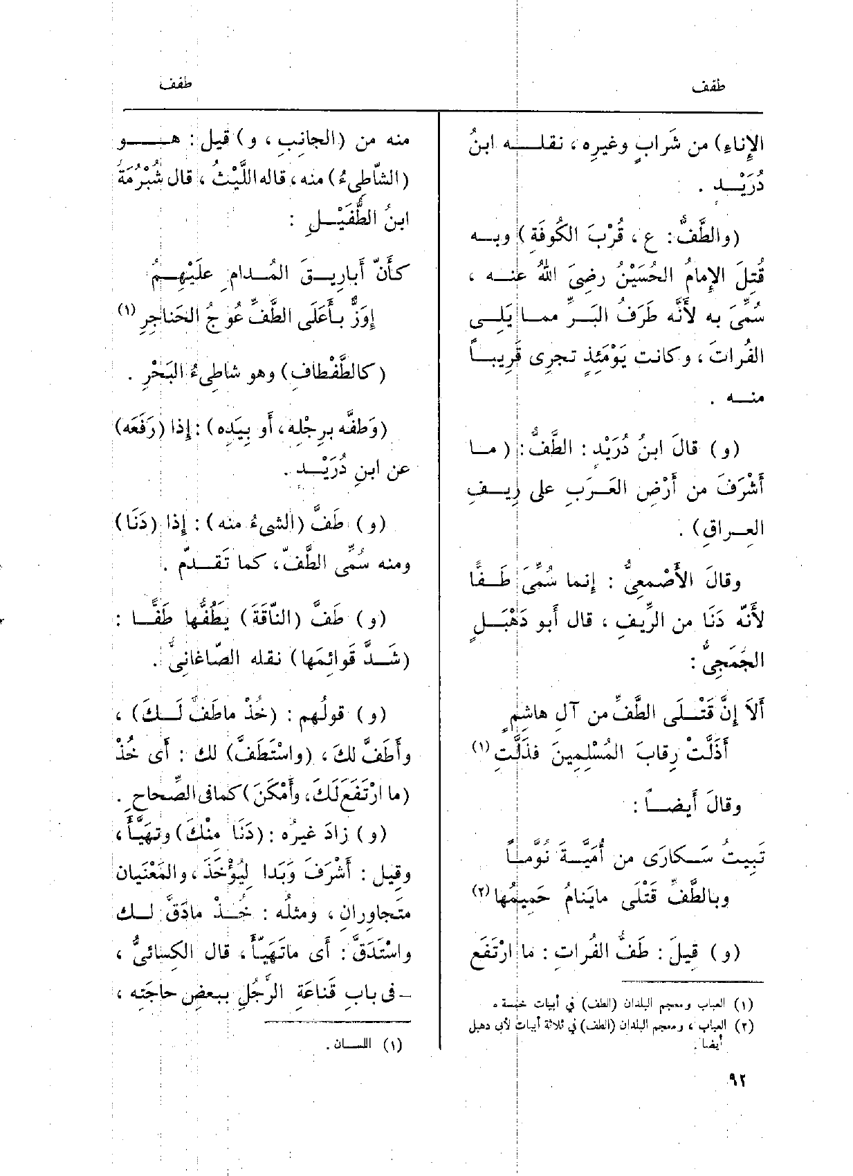 الإِناء من شَرابٍ وغيرِه، نَقله ابنُ دُرَيْدٍ. {والطَّفُّ: ع، قُرْبَ الكُوفَةِ وَبِه قُتِلَ الإِمامُ الحُسَيْنُ رضِيَ اللهُ عَنهُ، سُمِّيَ بِهِ لأَنَّه طَرَفُ البَرِّ مِمَّا يَلِي الفُراتَ، وَكَانَت يَوْمَئِذٍ تجرِي قَرِيباً مِنْهُ. وقالَ ابنُ دُرَيْدٍ:} الطَّفُّ: مَا أَشْرَفَ من أَرْضِ العَرَبِ على رِيفِ العِراقِ. وقالَ الأَصْمَعِيُّ: إِنما سُمِّيَ {طَفّاً لأَنّه دَنَا من الرِّيفِ، قَالَ أَبو دَهْبَلٍ الجُمَجِيُّ: